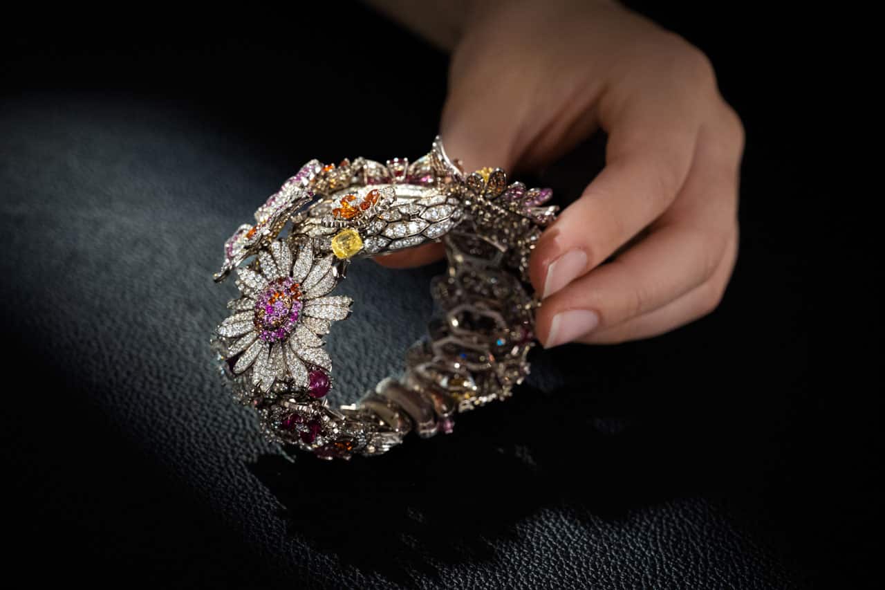 En esta obra de arte los maestros de Bulgari han logrado recrear un jardín frondoso, donde una mariposa, colocada “en tremblant” (una antigua técnica de joyería que da brillo a las piedras), se muestra lista para desplegar sus delicadas alas y una misteriosa serpiente se mueve sinuosamente por el florido jardín resplandeciente de diamantes combinados con un rubí, turmalinas rosas, granate mandarina, zafiros rosas y amarillos y cristal de roca.