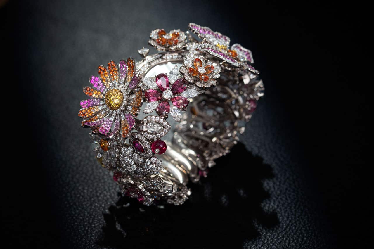La segunda pieza es el reloj Blooming Beauty que también se presenta con un collar a juego. En esta creación se aprecian delicadas flores que parecen brotar alrededor de una carátula de diamantes engastados con efecto nieve cubierta por una turmalina verde-menta de 9.6 quilates. Las esmeraldas colombianas ovaladas corte cabochon se combinan con turmalinas Paraiba, espinelas rosadas y moradas y diamantes redondos corte brillante en los brazaletes flexibles de platino que garantizan comodidad.