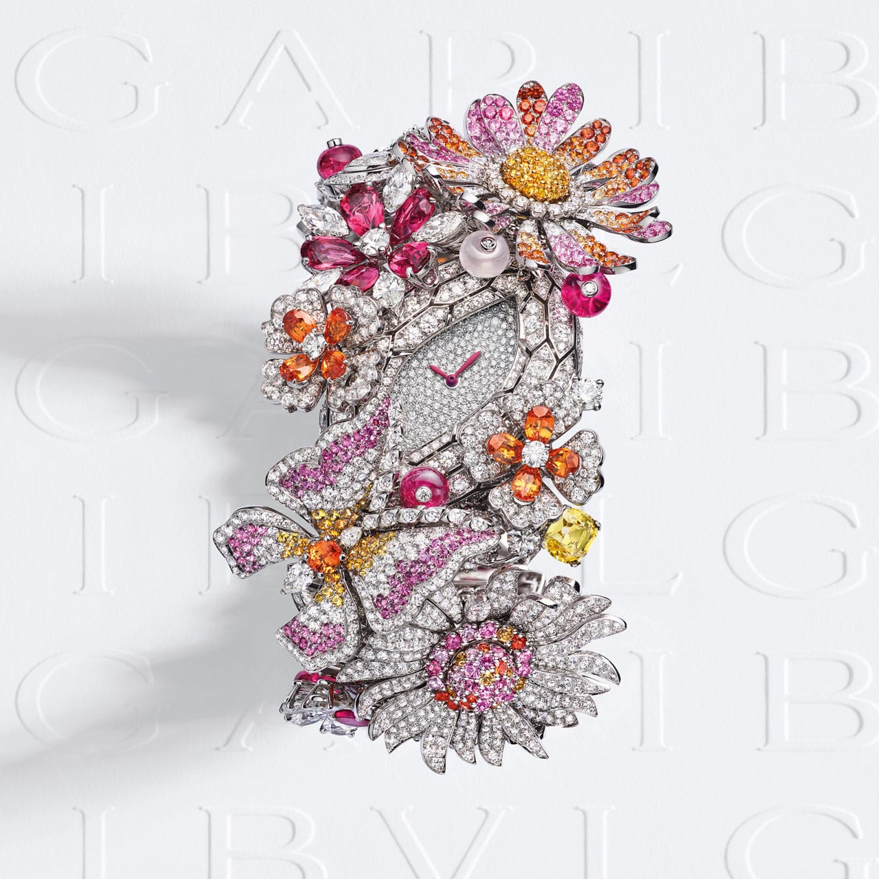 Más de 1,500 piedras componen el precioso reloj Giardino Dell’Eden Piccolissimo. En él se muestra una combinación de diseños de mariposas y flores inspirados en los diseños de Bulgari de la década de los sesenta.