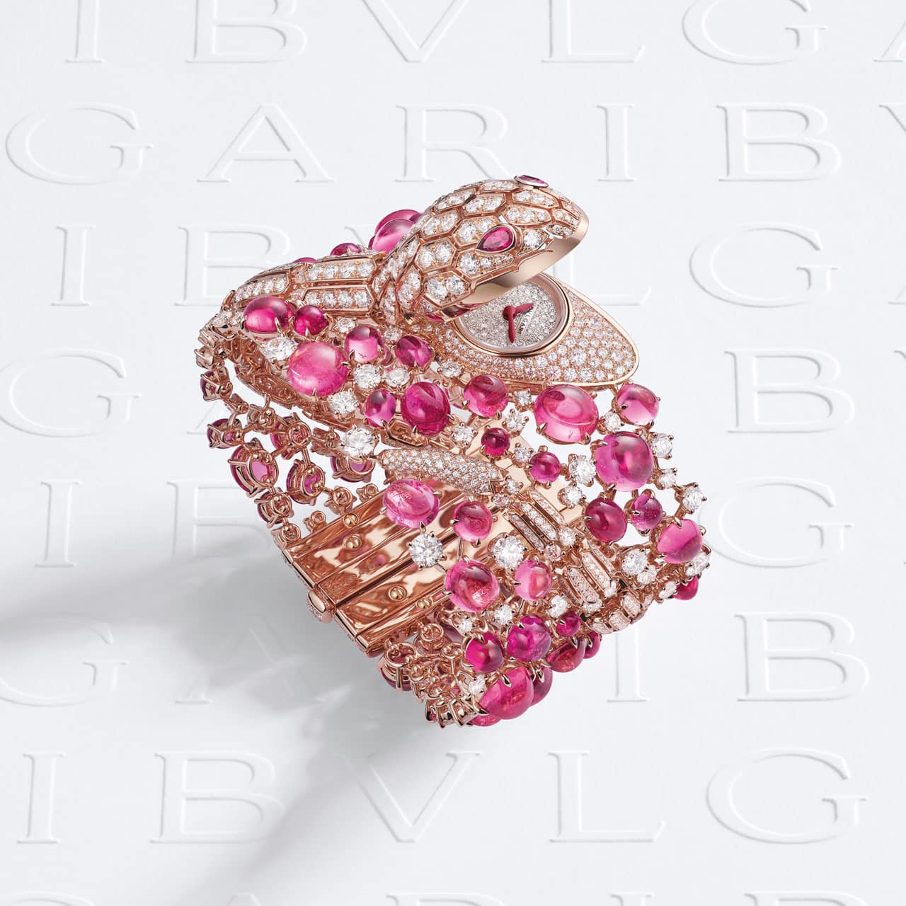 En esta creación, compuesta por más de 95 quilates de rubelitas, se recrea una puesta de sol ardiente sobre el mar Mediterráneo. Con una vibrante paleta de tonos rosados y rojos luce espectacular el reloj Serpenti Misteriosi Riviera, que celebra la icónica serpiente de Bulgari, un símbolo eterno de renacimiento y sabiduría.
