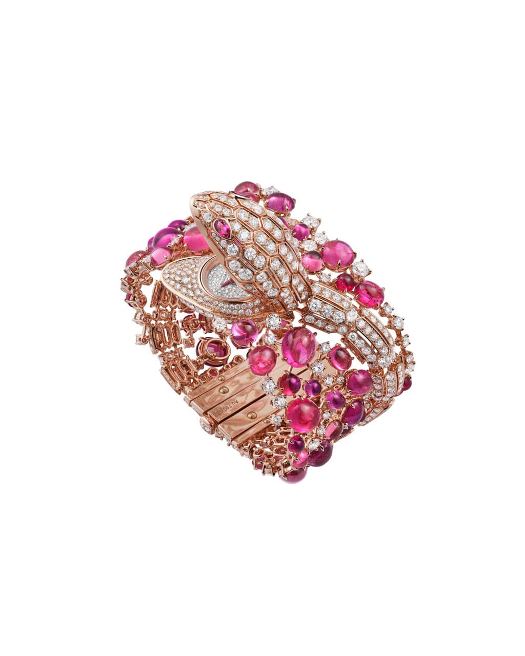 Este delicado reloj secreto –porque su carátula está oculta bajo la cabeza de la serpiente–, ofrece una combinación muy sofisticada y femenina de oro rosa, diamantes redondos corte brillante y rubelitas cabochon, que evoca los frutos prohibidos de un paraíso encantador.