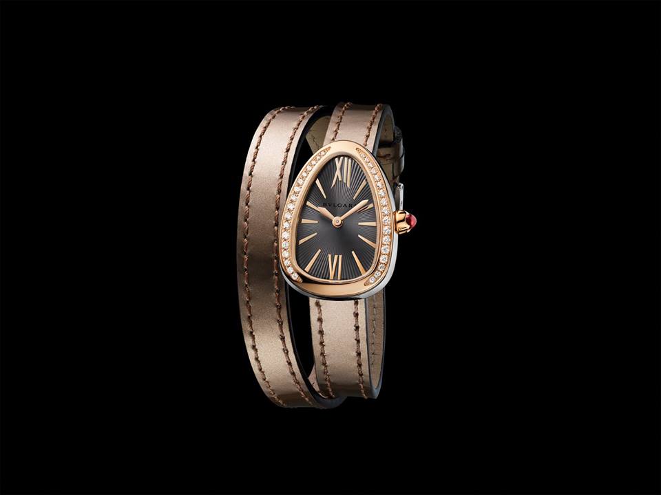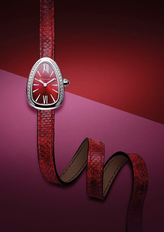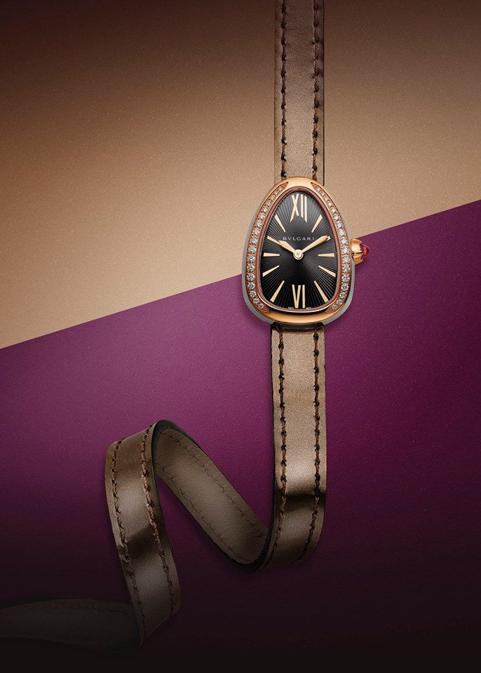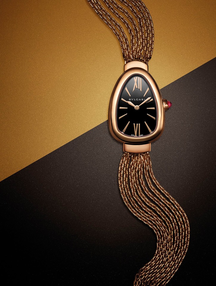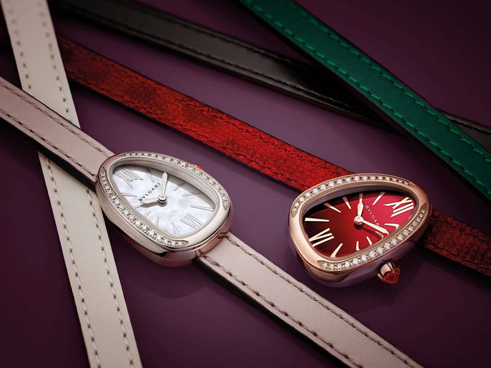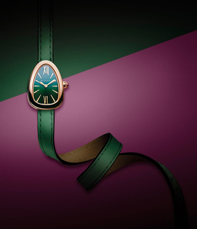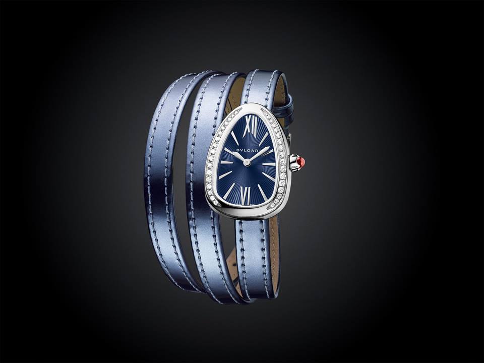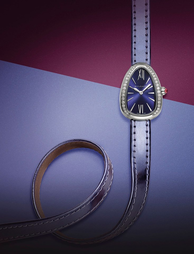 Desarrollado para las amantes de Serpenti, pero que han buscado un look diario para vestir de acuerdo a lo que llevan puesto o al color de la temporada, las nuevas referencias de esta colección destacan con una emblemática correa de cuatro vueltas disponible en nuevas tonalidades: azul índigo y jade. Adicionalmente el color dorado aparece para abrazar el instrumento de tiempo a la muñeca mediante eslabones maleables y un diseño que le permite intercambiarse por correas de piel. Serpenti Twist cuenta con una aplicación desarrollada por Bulgari, que lleva por nombre My Serpenti y con la cual se puede trabajar en la personalización de: caja, correa/brazalete y engaste de joyas a la pieza, además de contar con la posibilidad de grabar el reloj.