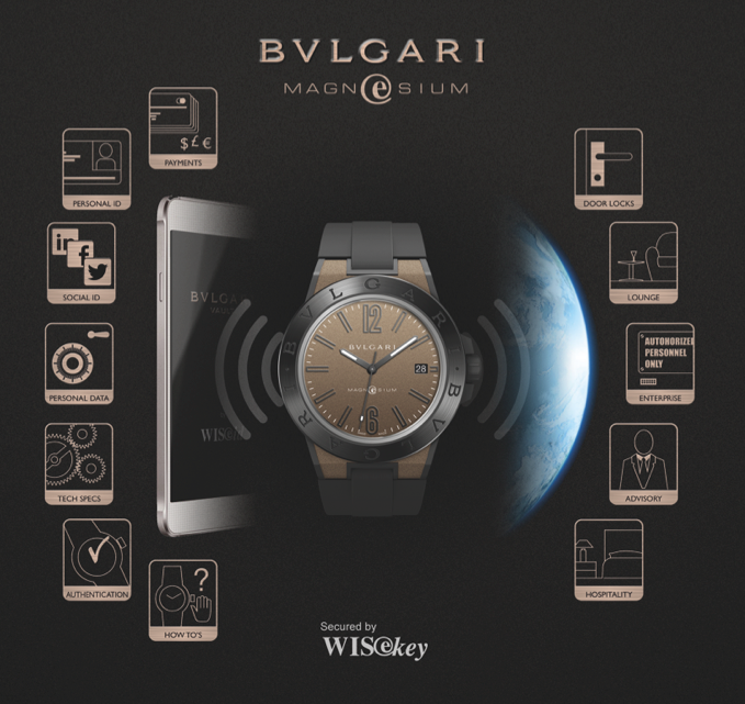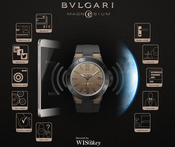 Bvlgari se ha asociado con WISkey, empresa especializada en seguridad a fin de producir un “bóveda en la muñeca”. Es el primer concepto de reloj capaz de garantizar la seguridad total de la información personal. Destacamos que cuando Bvlgari ingresa a la tecnología no irrumpe en la construcción tradicional de la pieza, sino que aloja un componente microtecnológico para la codificación de datos en conjunto con su teléfono celular. La pieza posee un mecanismo automático, pero sus datos confidenciales quedarán alojados al interior de este dispositivo que actúa como un pasaporte electrónico totalmente suizo, y es que se trata de la empresa WISeKey, proveedora de seguridad digital y almacenamiento de datos en territorio helvético.