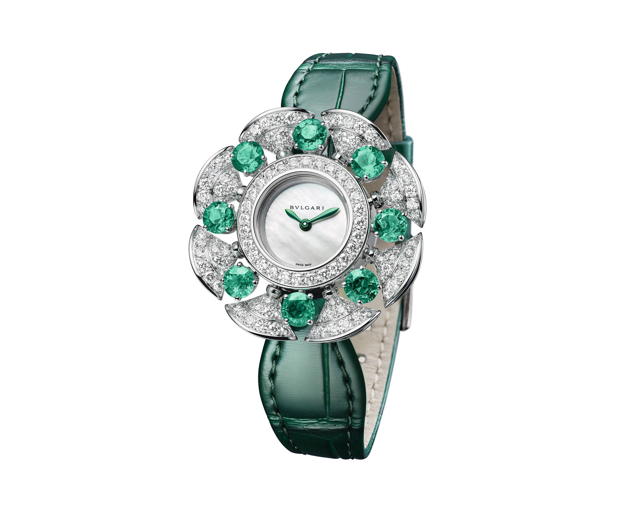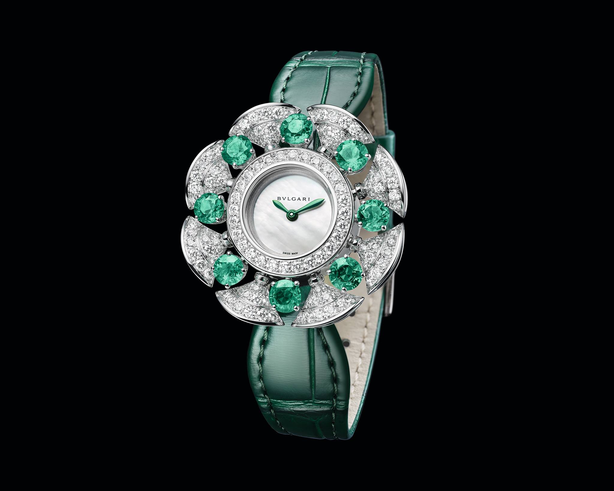 La carátula de nácar iridiscente está reforzada por ocho esmeraldas de talla brillante en un tono verde vivo, engastadas entre ondas de diamantes. Un dominio superior del engaste de gemas es evidente en las delicadas monturas, que amplifican la luz interior de las piedras preciosas para lograr un glamour de alto voltaje. El modelo completamente de diamantes presenta una carátula de diamantes engastados en la nieve rodeada de ondulantes ondas de diamantes. Presentado con una correa de piel de aligátor negra, es el epítome de la elegancia romana, con ocho diamantes de talla brillante colocados entre los motivos en forma de abanico.