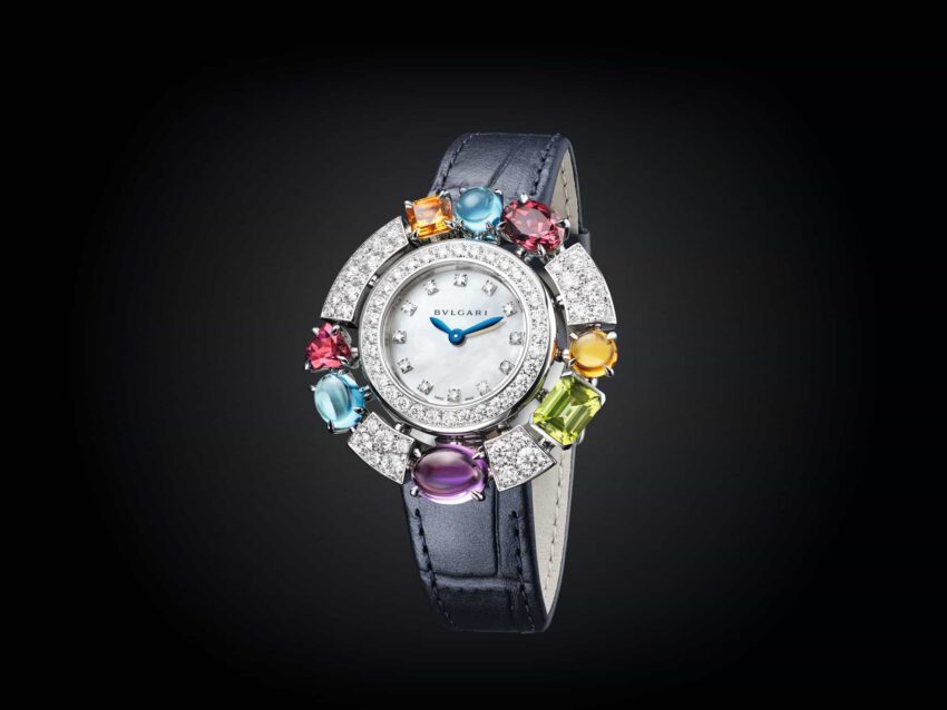 Por su parte, el Allegra rediseñado es un ejemplo deslumbrante del enfoque audaz de Bvlgari hacia los relojes de joyería. Una vivaz selección de piedras preciosas de diferentes cortes y formas (citrinos, amatistas, peridoto, topacio azul y rodolita) se colocan en órbita alrededor de la esfera de nácar, creando una impresionante exhibición de brillo. En contraste con el brillo de más de 80 diamantes, la fascinante mezcla de piedras preciosas facetadas y cabujón forma un resplandeciente halo de piedras que se mueve suavemente gracias a los engastes de metal elaborados por expertos. Disponible en oro blanco o rosa, ambas versiones ahora se presentan con correa de cocodrilo, lo que lo convierte en un reloj de cóctel que se puede usar todo el día.