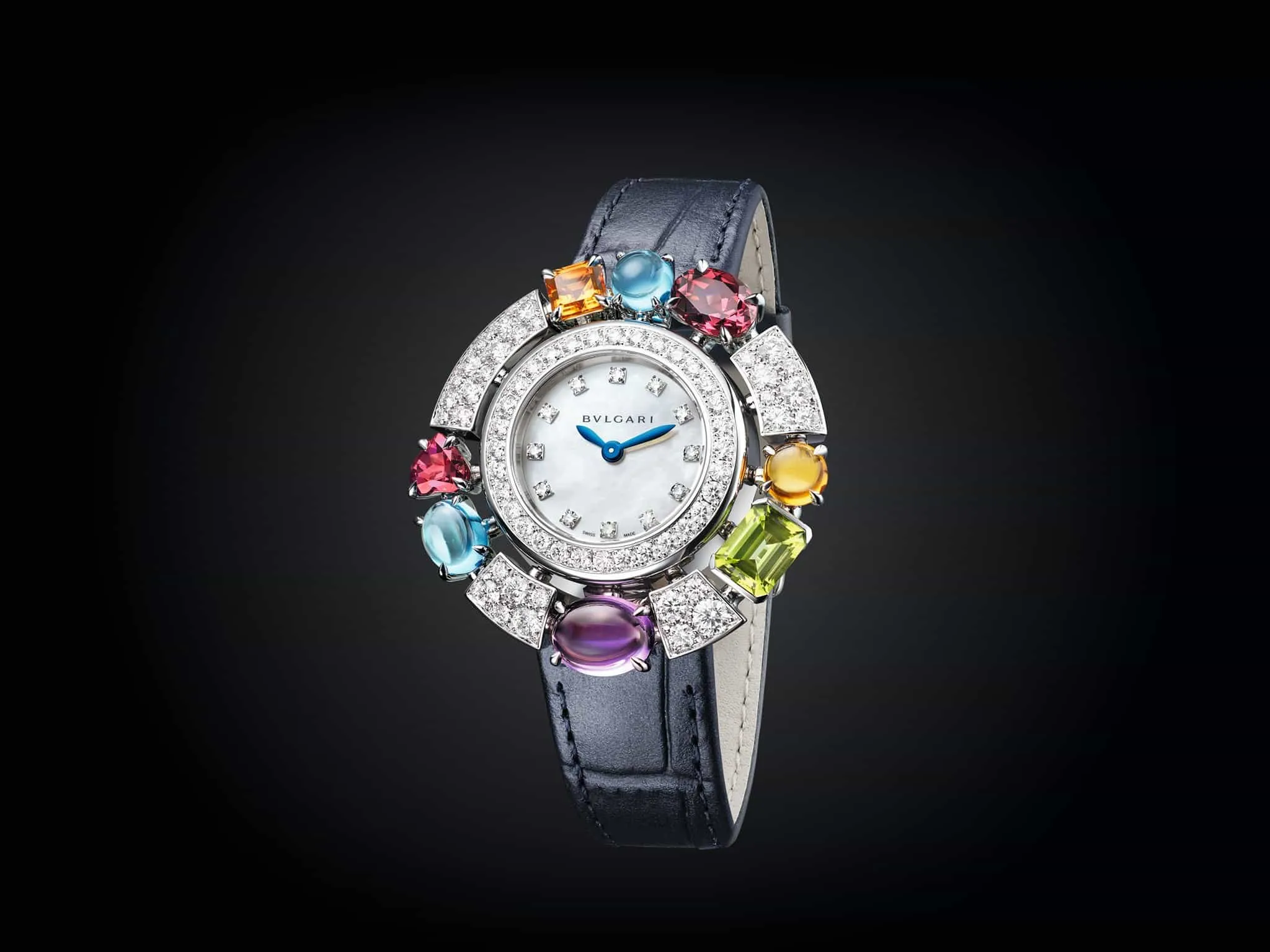 - Caja: 36 mm de oro rosa o blanco, engastada con 82 diamantes talla brillante; 2 citrinos, 2 amatistas, 1 peridoto, 2 topacios, 1 rodolita