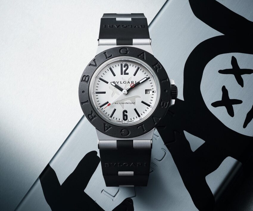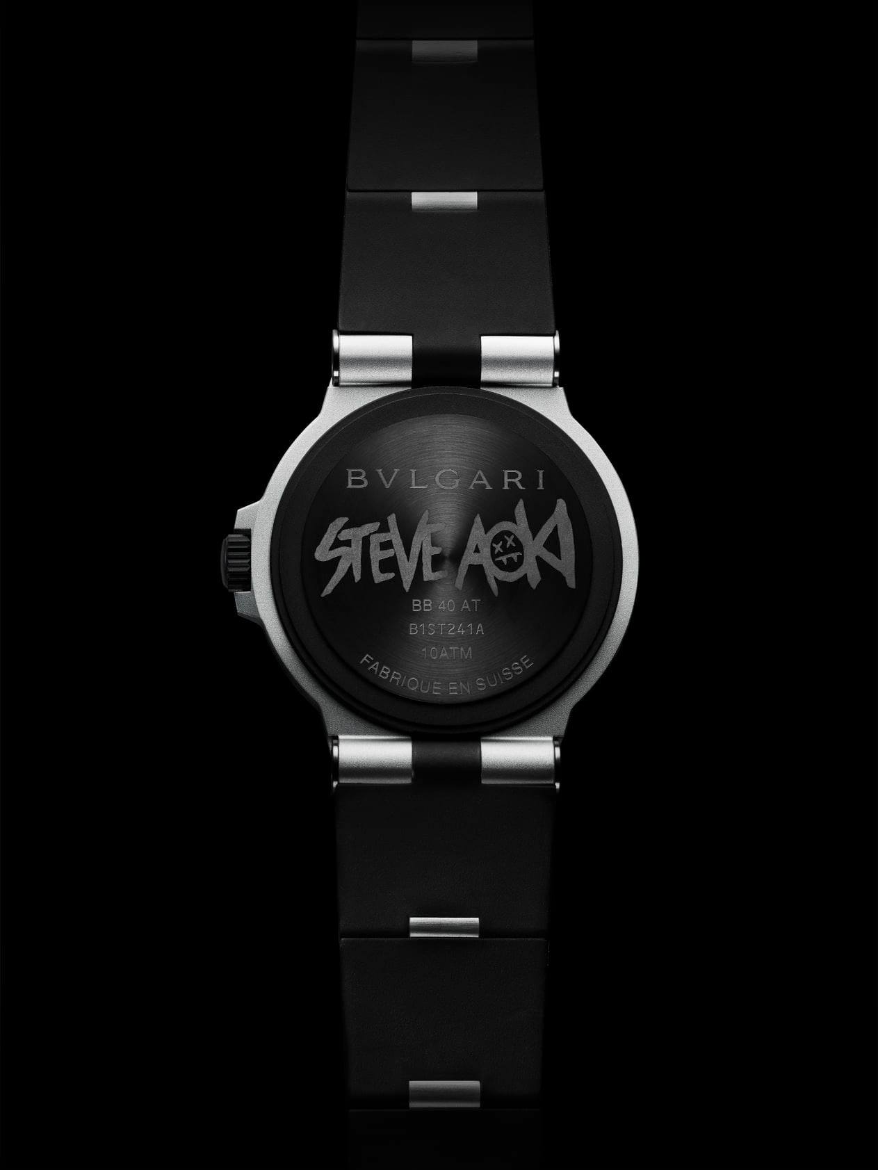 La más reciente generación de Bvlgari Aluminium ha sido utilizado como base para esta colaboración especial, siendo un instrumento ideal para representar el glamour de un rave o festival musical. La pieza se diferencia del reloj tradicional gracias al detalle de la firma de Aoki en la carátula, que además fue revestido con Super-LumiNova para que cobre vida durante la noche. La caja se extiende hasta los 40 mm de diámetro, fabricada en aluminio con fondo de titanio tratado con DLC. Visto desde el lateral, se puede apreciar el brillo mate y opaco del aluminio muy en sintonía con el carácter deportivo del reloj.