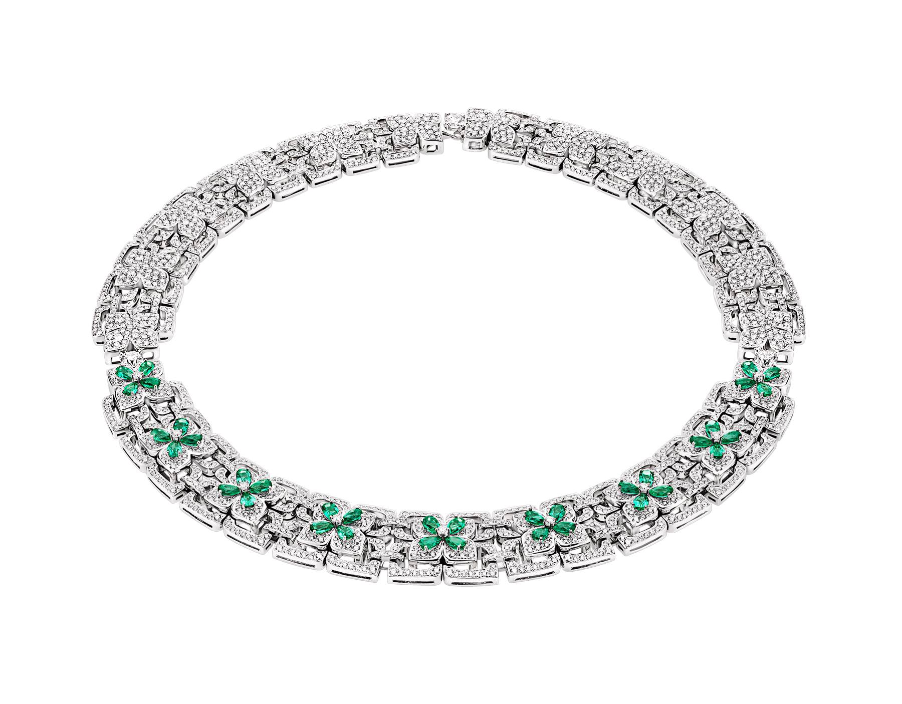 Collar High Jewelry Giardini en oro blanco con 3 diamantes redondos talla brillante (1,51 ct), 36 esmeraldas (6,28 ct) y diamantes en pavé (19,01 ct).