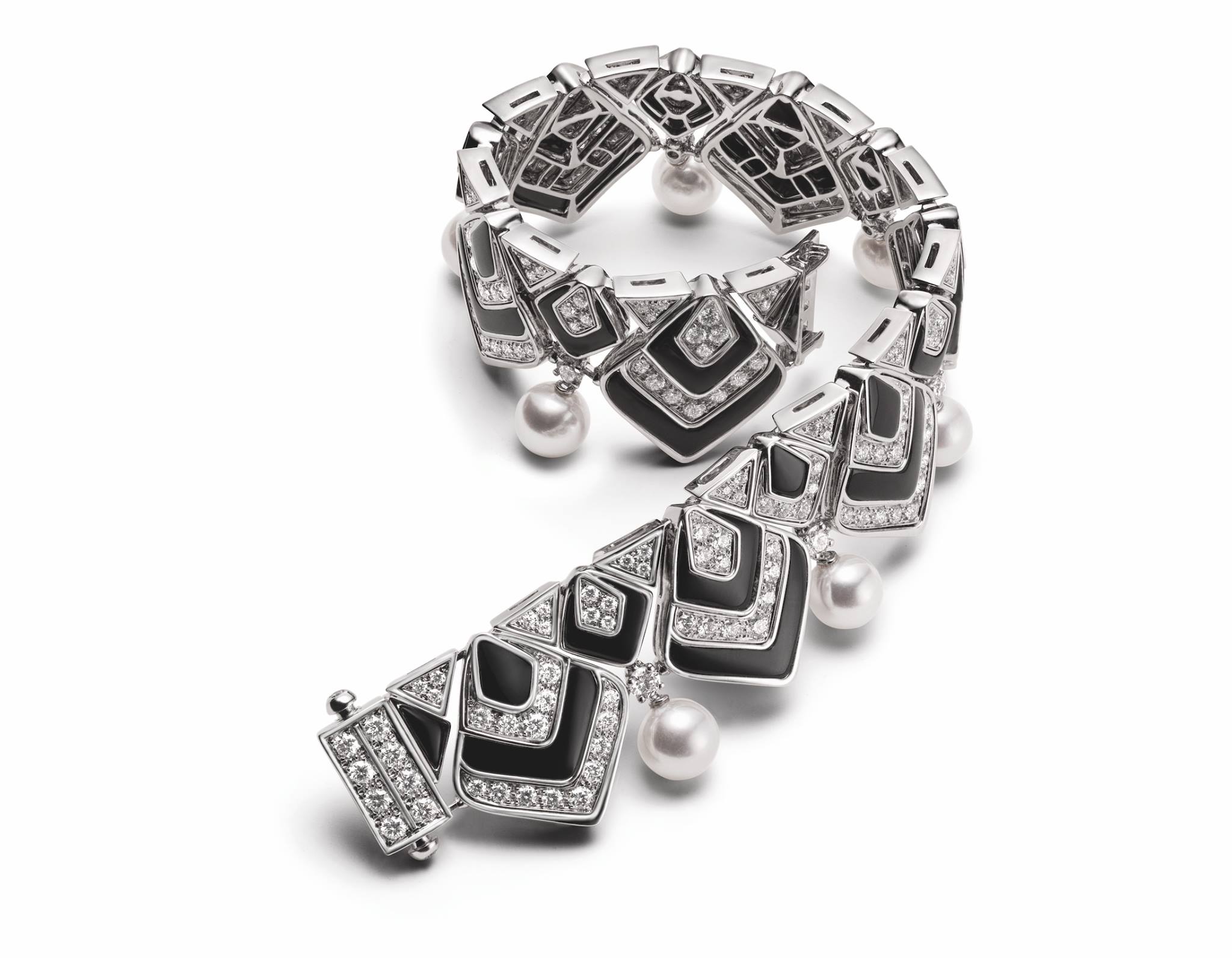 Pulsera Barocko High Jewelry de oro blanco con elementos de ónix, 7 perlas cultivadas “Akoya”, 7 diamantes redondos y pavé de diamantes (4,49 ct).