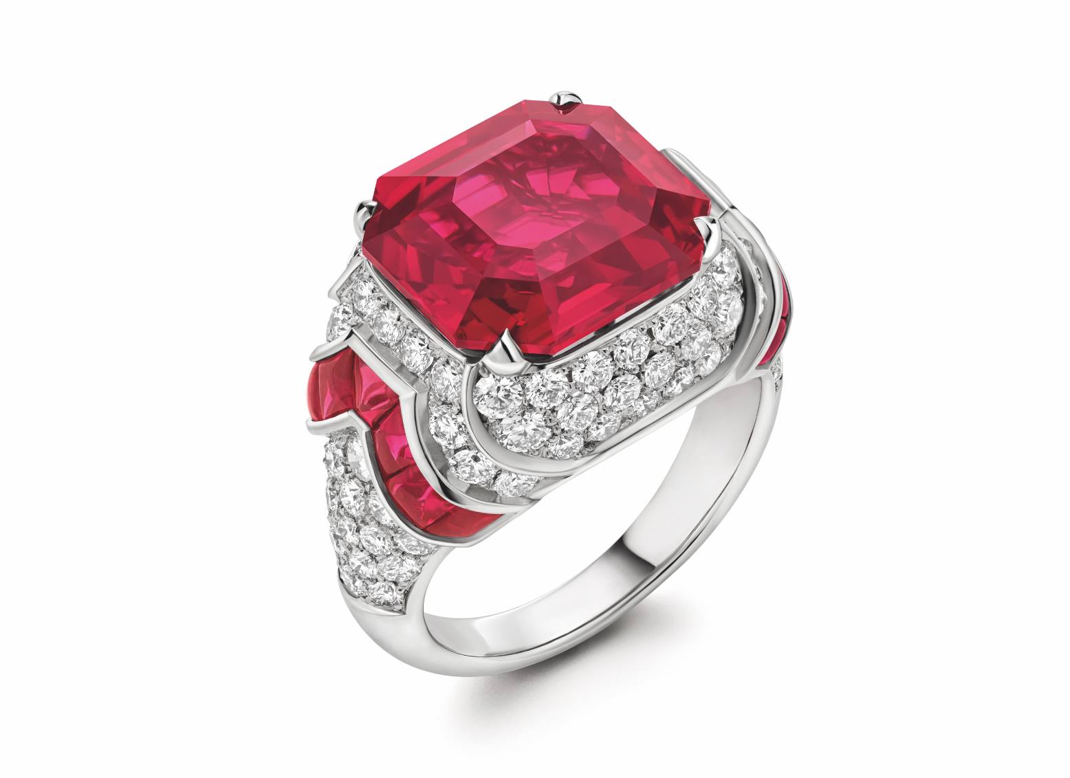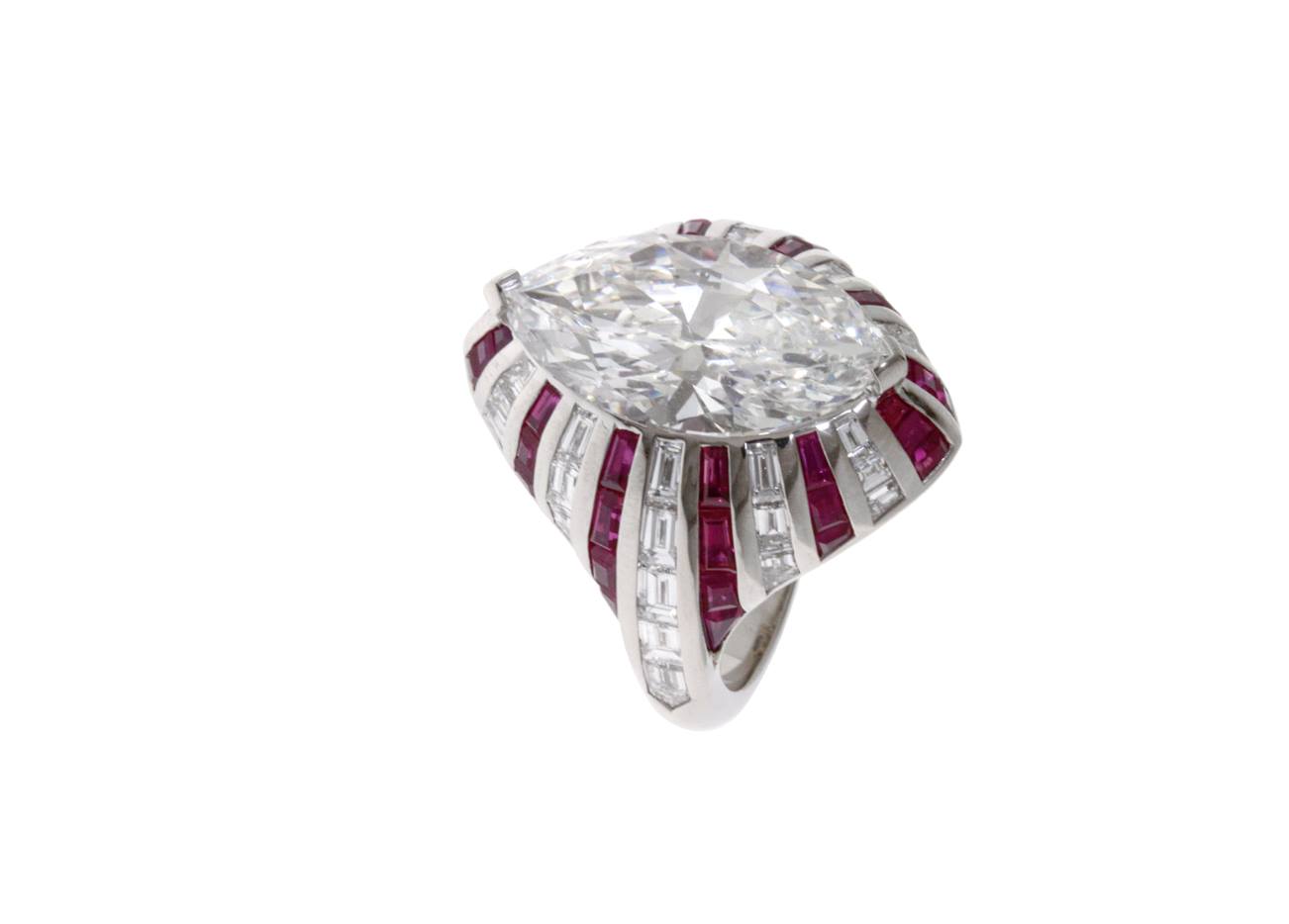 Anillo de Alta Joyería en platino con 1 diamante talla marquesa (5,38 ct), 40 rubíes talla escalonada (2,18 ct) y 34 diamantes talla escalonada (1,89 ct).