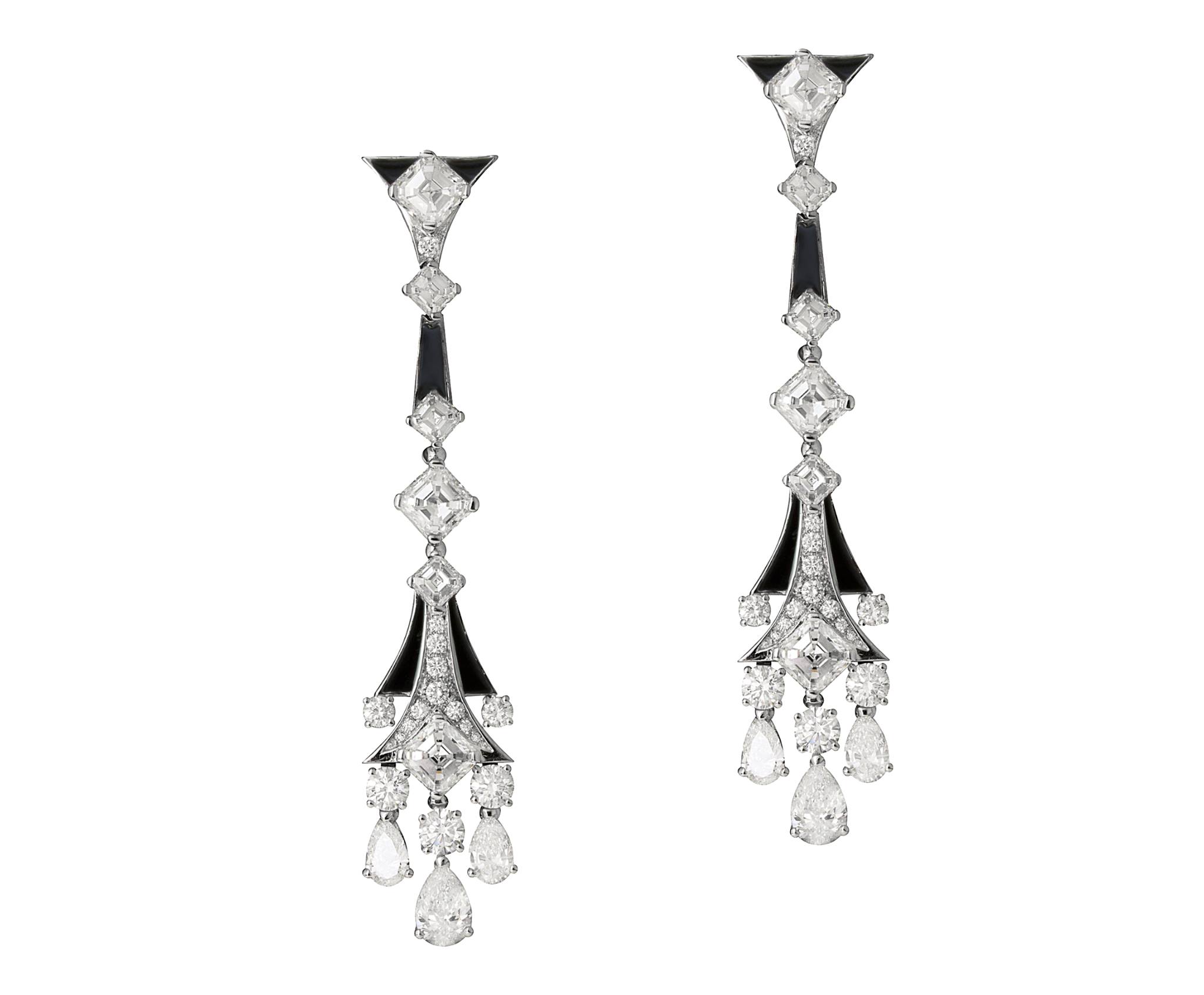 Pendientes de Alta Joyería en oro blanco con inserciones de ónix y 6 diamantes cuadrados talla esmeralda (6,47 ct), 6 diamantes talla brillante pera (2,65 ct), 6 diamantes cuadrados talla esmeralda (1,44 ct), 10 diamantes redondos talla brillante y diamantes en pavé (1,10 quilates).