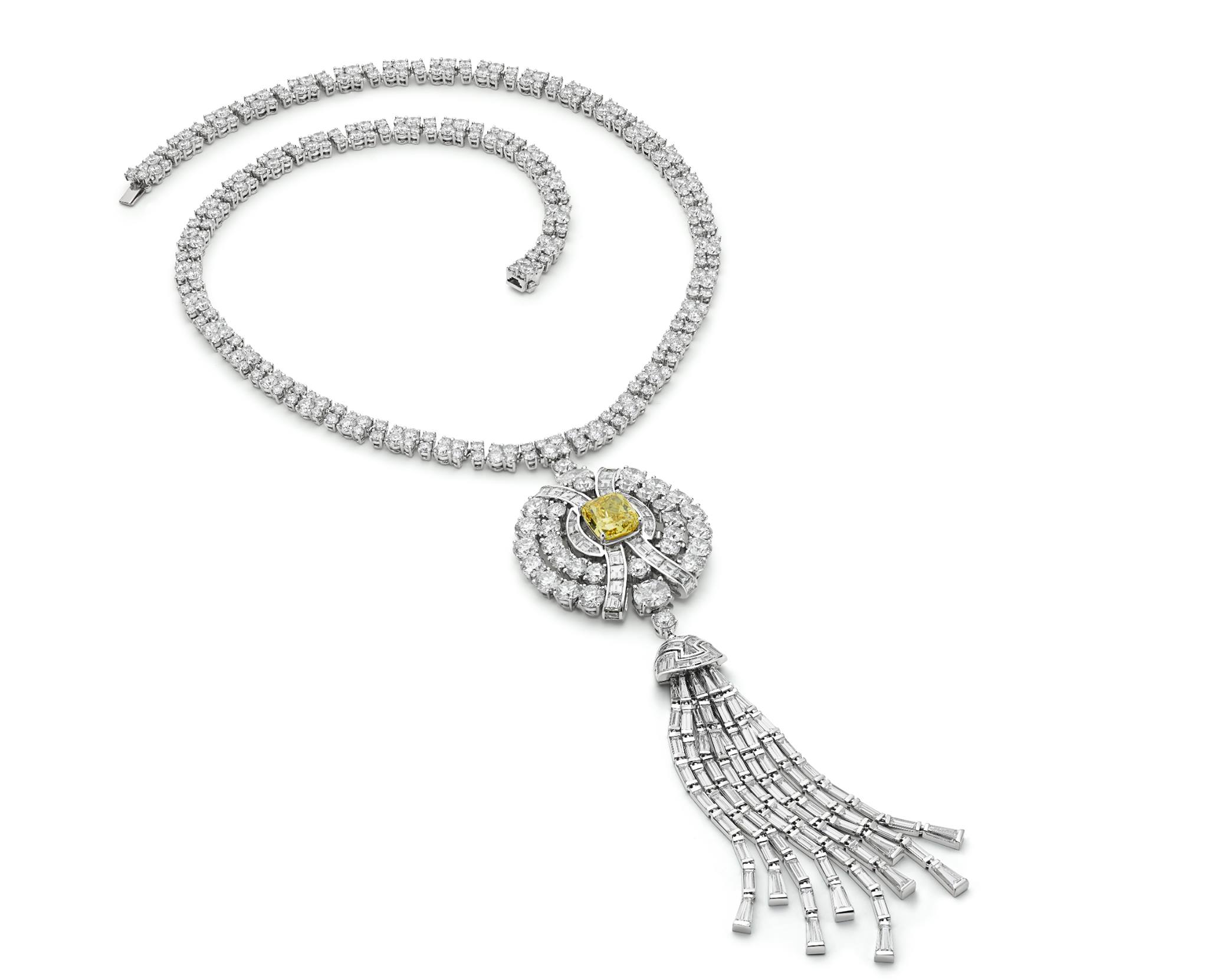 Collar High Jewelry en platino con 1 diamante de color amarillo vivo de fantasía talla cojín (6,00 ct), 18 diamantes (18,18 ct), 693 diamantes talla escalonada de forma elegante (49,30 ct), 398 diamantes redondos talla brillante y diamantes en pavé (61,50 quilates).