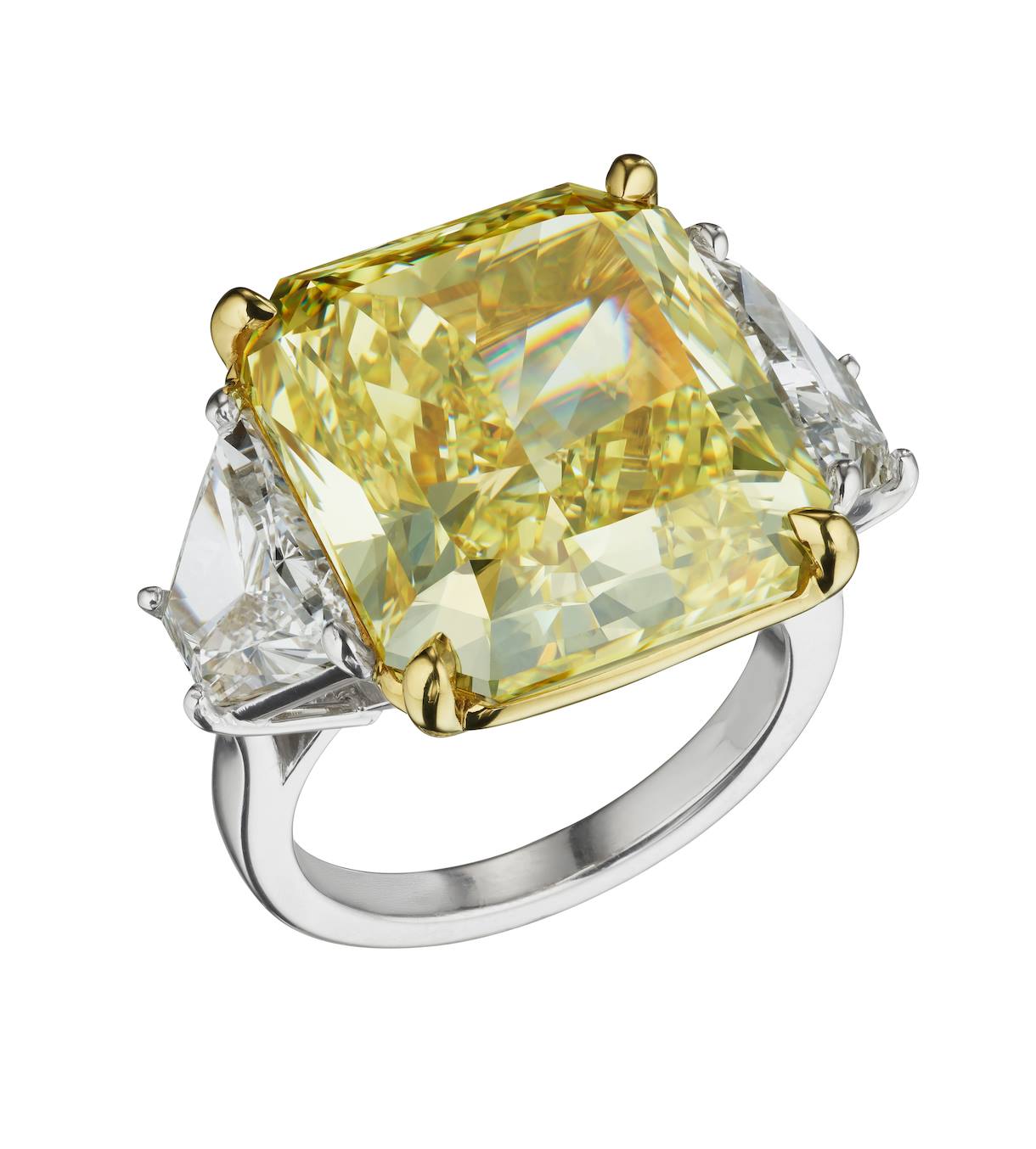 Anillo de alta joyería en platino con un elegante diamante amarillo intenso (21,14 cts) y dos diamantes trapecio (3,07 cts).