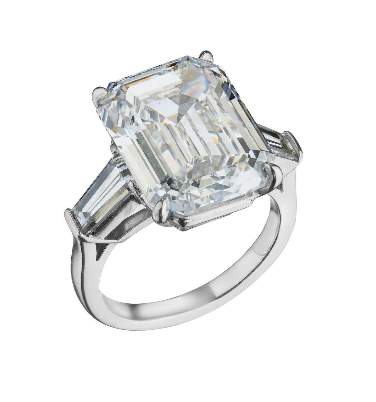 Anillo de alta joyería en platino con un diamante talla esmeralda (9,90 ct) y dos diamantes baguette (1,35).