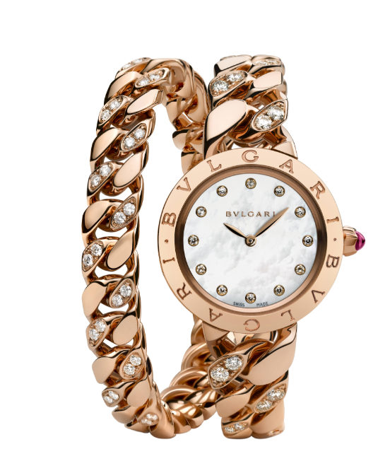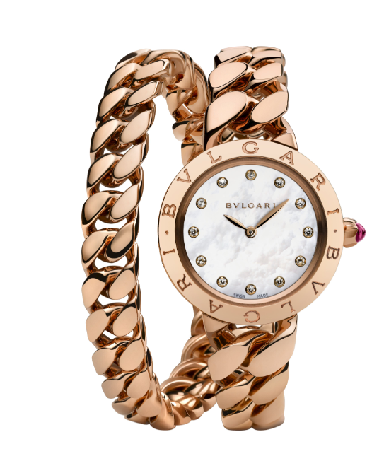 Hoy, Bvlgari logra entrelazar en su nueva creación la simplicidad, tradición y elegancia en un reloj joya de extraordinaria belleza. Aproximadamente 140 g de eslabones de oro rosa conforman a la perfección tan sutil extensión de la caja de oro de 18 quilates que no solo presenta el doble logotipo de Bvlagri en el bisel, sino también una carátula de madreperla con 12 diamantes de corte brillante de 0.133 quilates y una rubelita de corte cabujón que realza la corona estriada. El numen de este sofisticado reloj: la ya clásica gourmette, término por el que se conoce en francés a la “esclava”, que Bvlgati reinterpreta y devuelve su autenticidad anterior. Famosa por adornar la muñeca de divas de nuestra era como Elizabeth Taylor, Anna Magnani y Grace Kelly, su atemporalidad se acentúa para convertirse en el BVLGARI BVLGARI Catene de hoy. Ahora este símbolo eterno de romanticismo se transforma en un reloj de pulsera de doble vuelta que debe su flexibilidad, sin lugar a dudas, a Ia sofisticación de su estructura. Sin embargo, Ia aparente sencillez por la que se caracteriza la delicada elegancia de este reloj traiciona su complejidad: con su savoir-foire insuperable, los orfebres de Bvlgari dan vida a una pulsera que se funde en un doble abrazo que se amolda perfectamente a la muñeca. Como solo ella sabe hacer, se imbuye de la historia y de la esencia vintage de tan jovial adorno clásico: Bulgari se reafirma una vez más como estandarte de brillante creatividad.