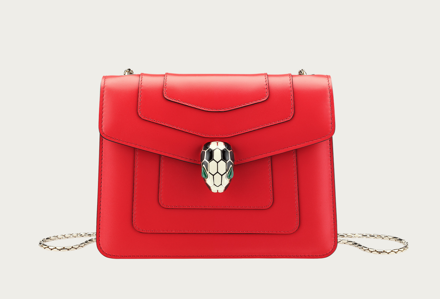 Por último, el bolso rojo incandecente con cierre con cabeza Serpenti de latón bañado en oro blanco, esmalte blanco y negro con ojos de malaquita, representa la pasión de la feminidad y tenacidad.