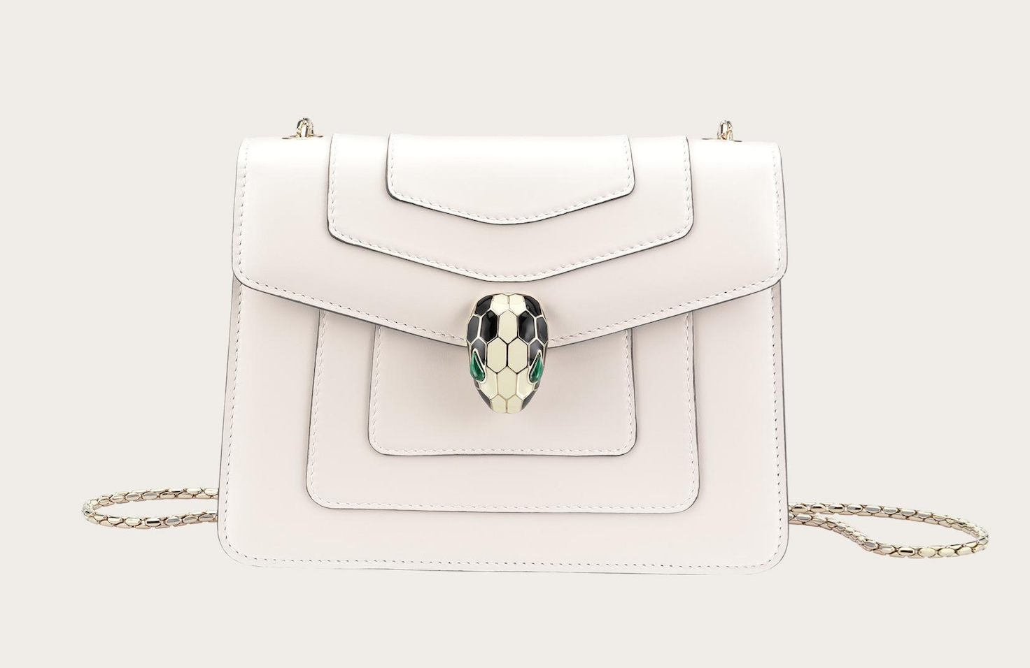 El segundo hecho piel de becerro color ágata blanca con cierre con cabeza Serpenti de latón bañado en oro blanco, esmalte blanco y negro con ojos de malaquita, se caracteriza por la pureza y elegancia.