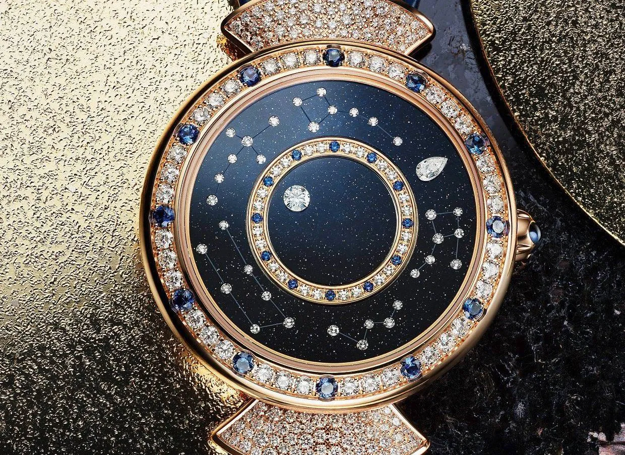El bisel de la pieza está engastado con diamantes y zafiros, además de que porta una corona en oro rosa que destaca gracias a un zafiro engastado. En el interior vibra el calibre mecánico automático de manufactura BVL 308, visible mediante un fondo de cristal de zafiro semitransparente que ofrece información de la Osa Menor, la Andrómeda y los signos zodiacales.
