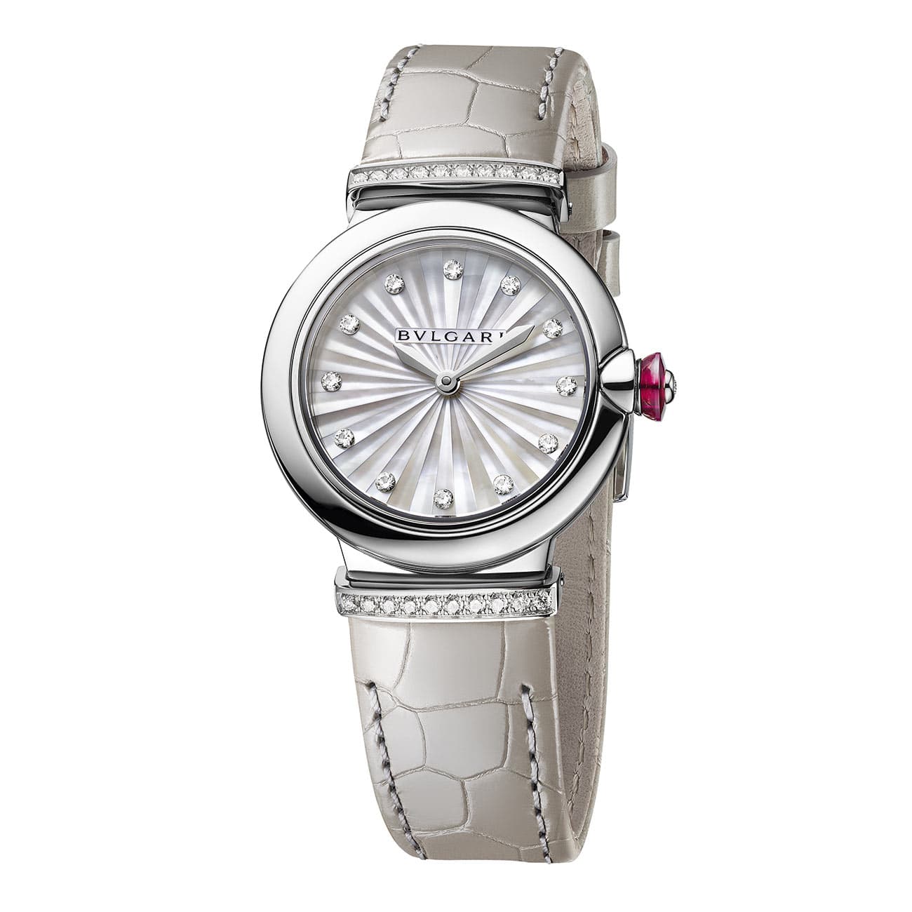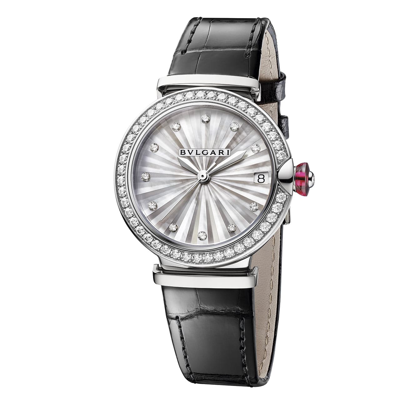 Fomentando una técnica clásica de métiers d’art aplicada al nácar, el nuevo reloj Lvcea Intarsio Marquetry infunde el reloj redondo diario característico de la Maison con un toque adicional. Cada interpretación presenta una carátula de nácar gris que deja pasar la luz a través de ella, recordando el cielo romano en su perlescencia azul y blanca.