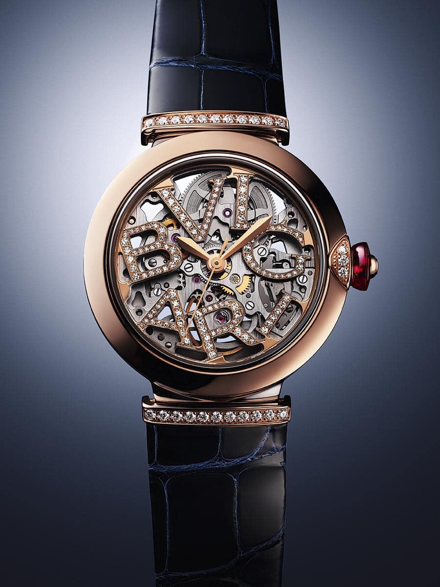 Una ventana fascinante al arte de la relojería, rinde homenaje a la deslumbrante y delicada complejidad de los relojes mecánicos, una exhibición virtuosa de la Alta Relojería que revela las profundidades ocultas del modelo. Al interior vibra el BVL 191 de cuerda automática, elaborado internamente en la manufactura de Bvlgari en Suiza. Y, en un toque de glamour irreverente que es inconfundiblemente Bvlgari, las letras del logotipo del relojero son la esencia del diseño esqueleto. Engastado con 140 diamantes, su esfera es una ingeniosa fusión de forma y función. Con una caja de acero con bisel dorado, la esfera del reloj tiene un acabado adicional con una piedra rosa talla cabujón en la corona y viene con una correa de piel de aligátor azul con hebilla de pasador.
