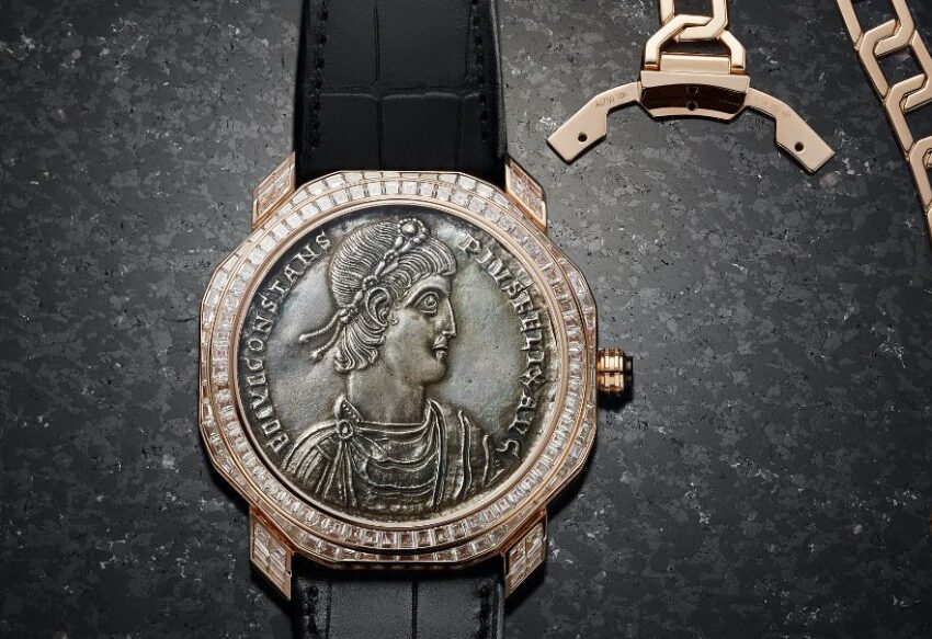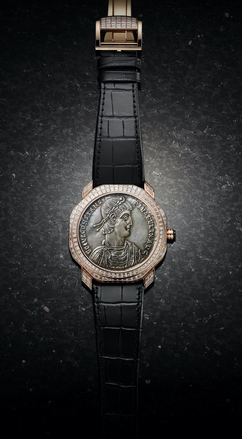 Traducción al español de monedas, reloj de moneda, la pieza es precisamente esto y más. La caja Octo de oro rosa funge como escenario para el engaste de diamantes talla brillante a lo largo y ancho del bisel, cuernos y carrura. Mientras que en el centro la imagen protagonista de una moneda romana del siglo IV, la cual marcaba el reinado de Constantino Augusto que fue del 301-336 después de Cristo.