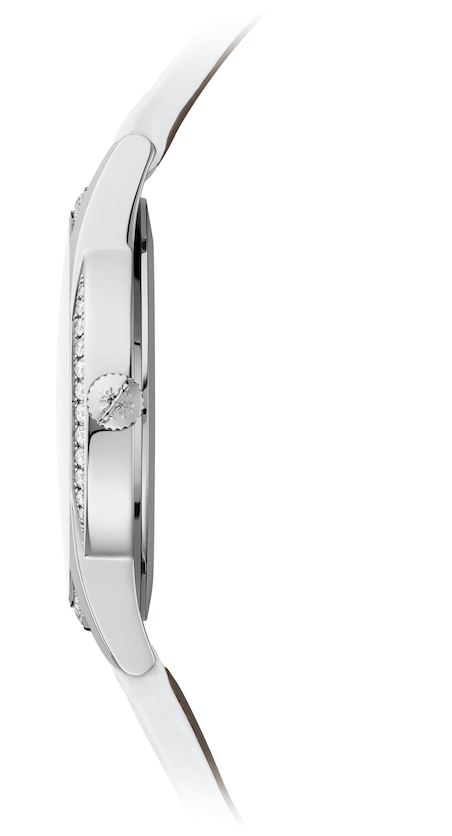 La simbología que representa este modelo evoca a la pureza, integridad y serenidad de la vida, por lo que será perfecto combinarlo con un gran número de atuendos durante el día o la noche, y abrazarlo a la muñeca mediante una correa de piel de cocodrilo –de grandes escamas cuadradas– con un toque suave de brillo nacarado blanco.