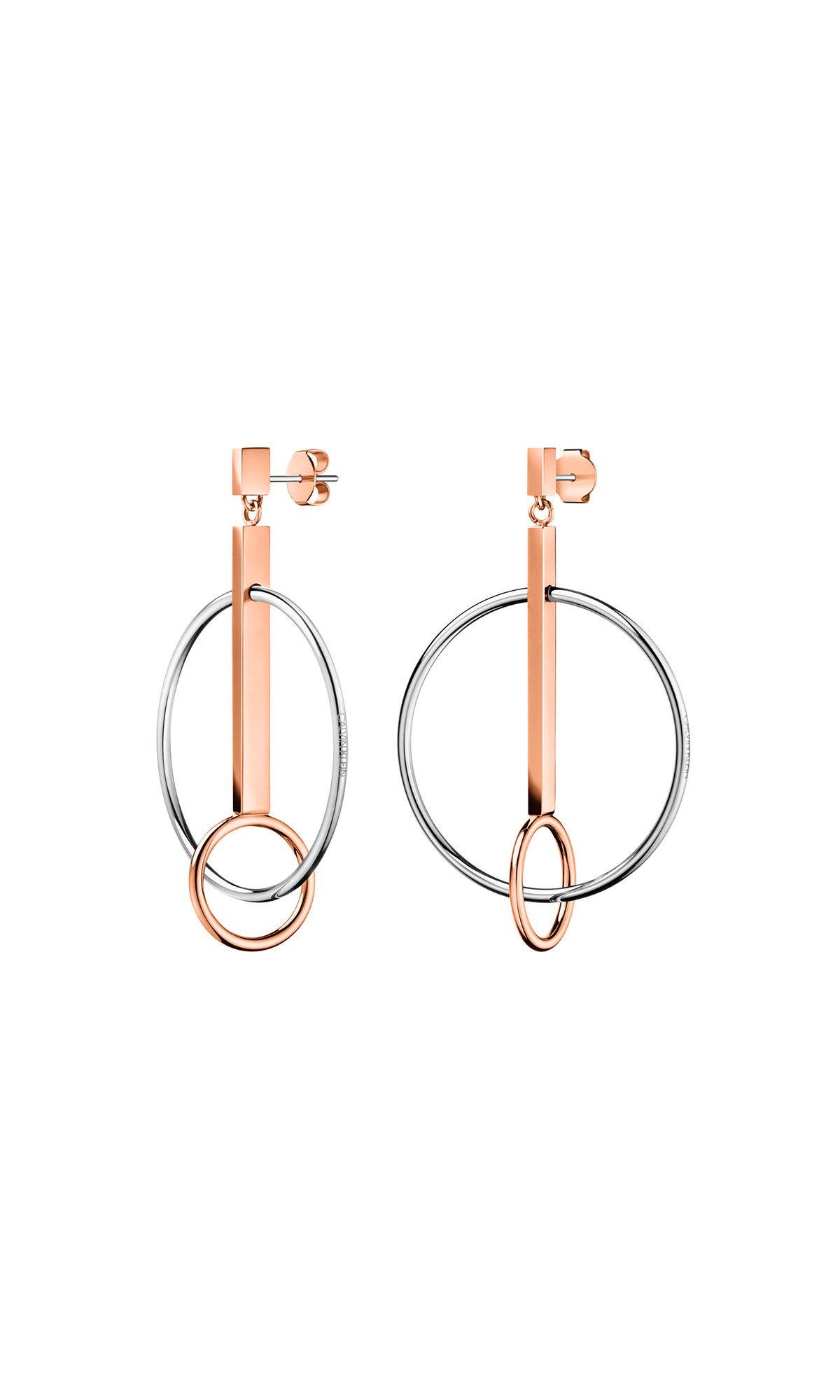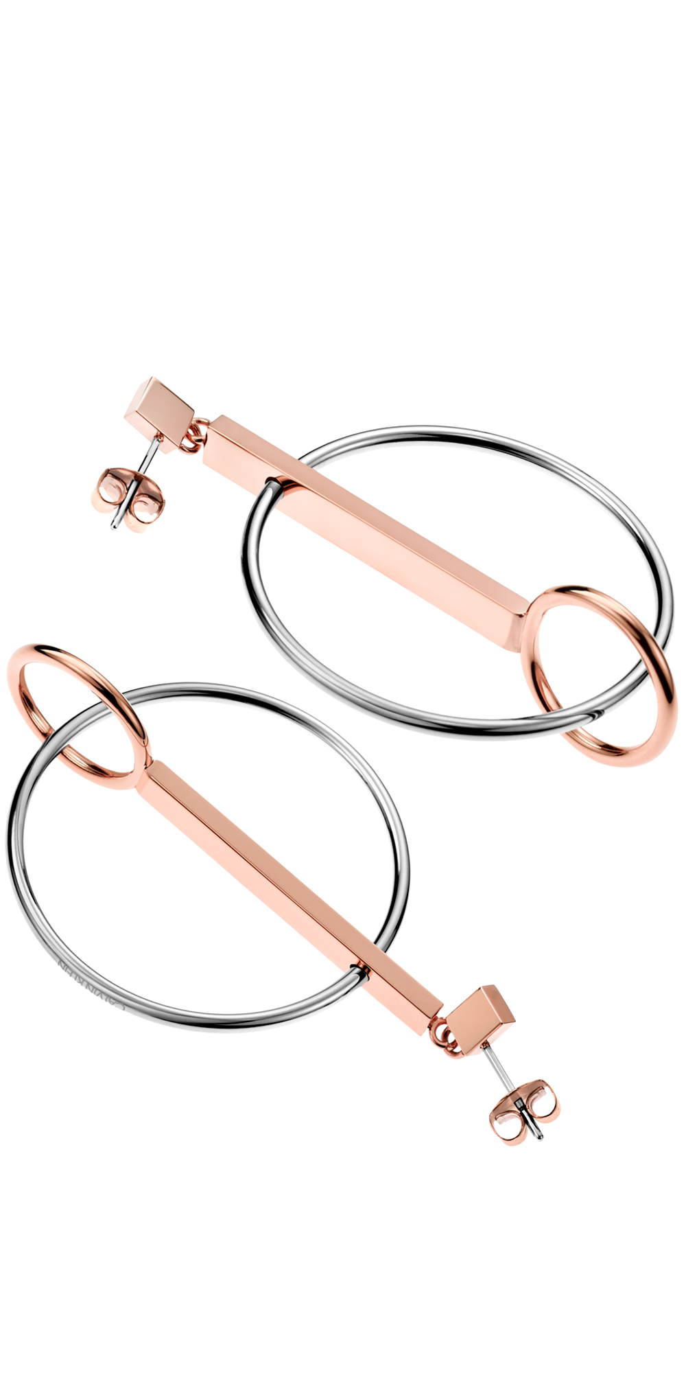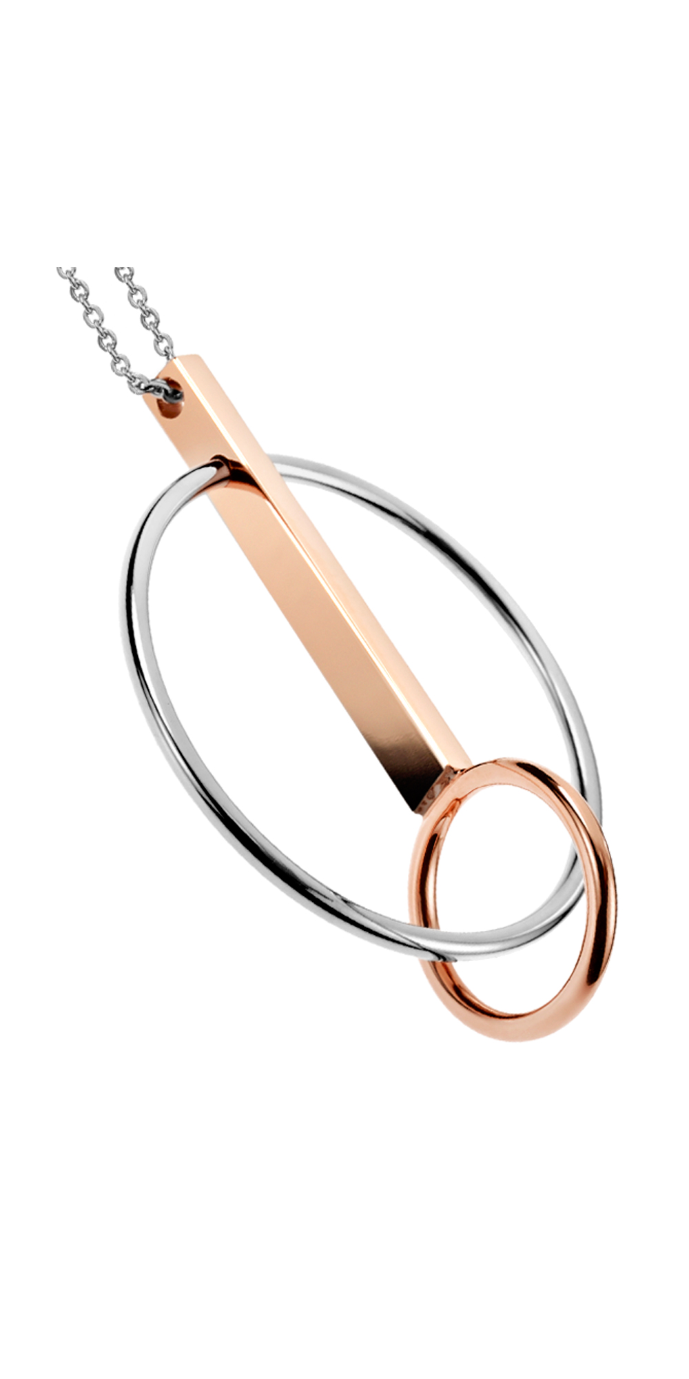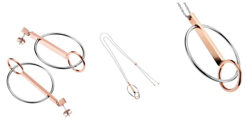 Un colgante para dama y su juego de aretes juegan con la geometría de las líneas rectas y aros circulares, el conjunto está fabricado en acero inoxidable y recubierto con PVD oro rosa.