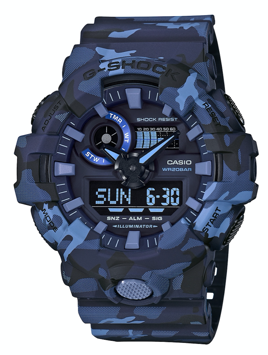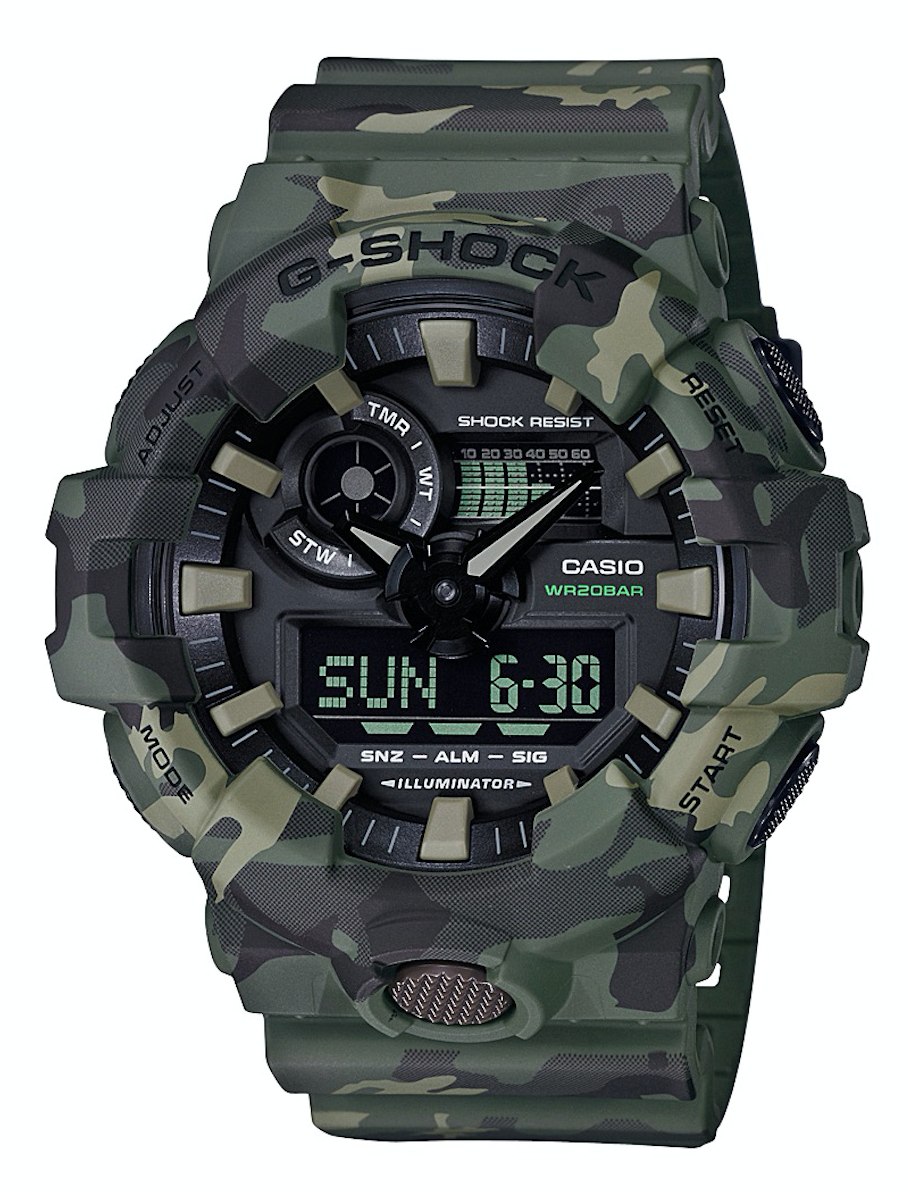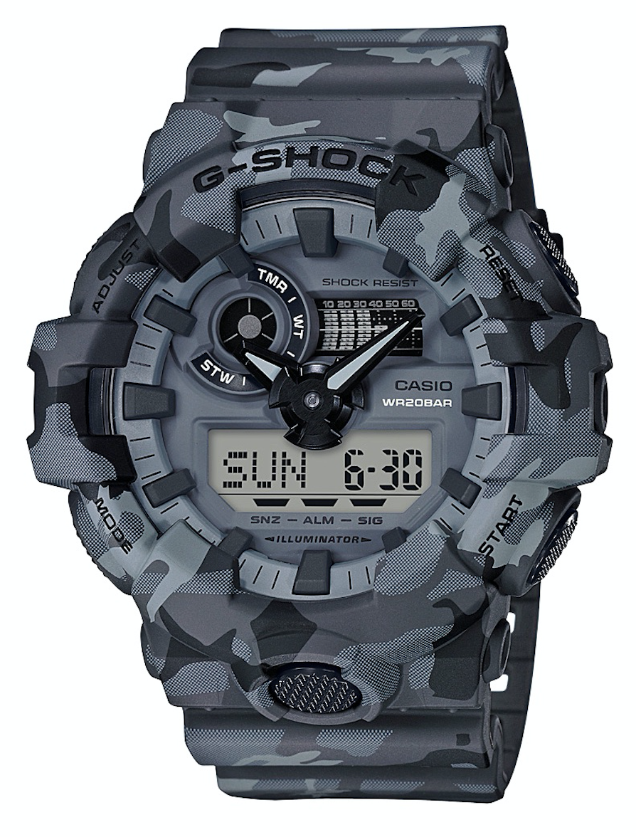 Camouflage incorpora tres relojes en diferentes tonos: GA-700CM-2A en azul, el GA-700CM-3A en verde militar y el GA700CM-8A en gris, todos resistentes a impactos, con súper iluminado LED, horas mundiales, temporizador a centésimas de segundo en tiempo parcial, cronómetro y 5 alarmas diarias.