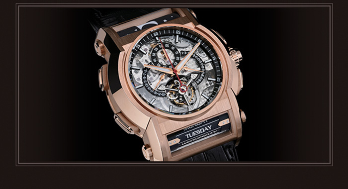 Si recorremos la carátula encontraremos las horas, minutos y el contador de 60 segundos del crono en posición coaxial, mientras que el tourbilon y la indicación del día de la semana aparecen en punto de las 6 h; un sistema retrógrado GMT se exhibe a las 9, mientras que el contador de 60 minutos del cronógrafo y el rodillo de las fases de Luna aparecen a las 12 h, por último, la fecha retrógrada ocupa la posición de las 3 horas.