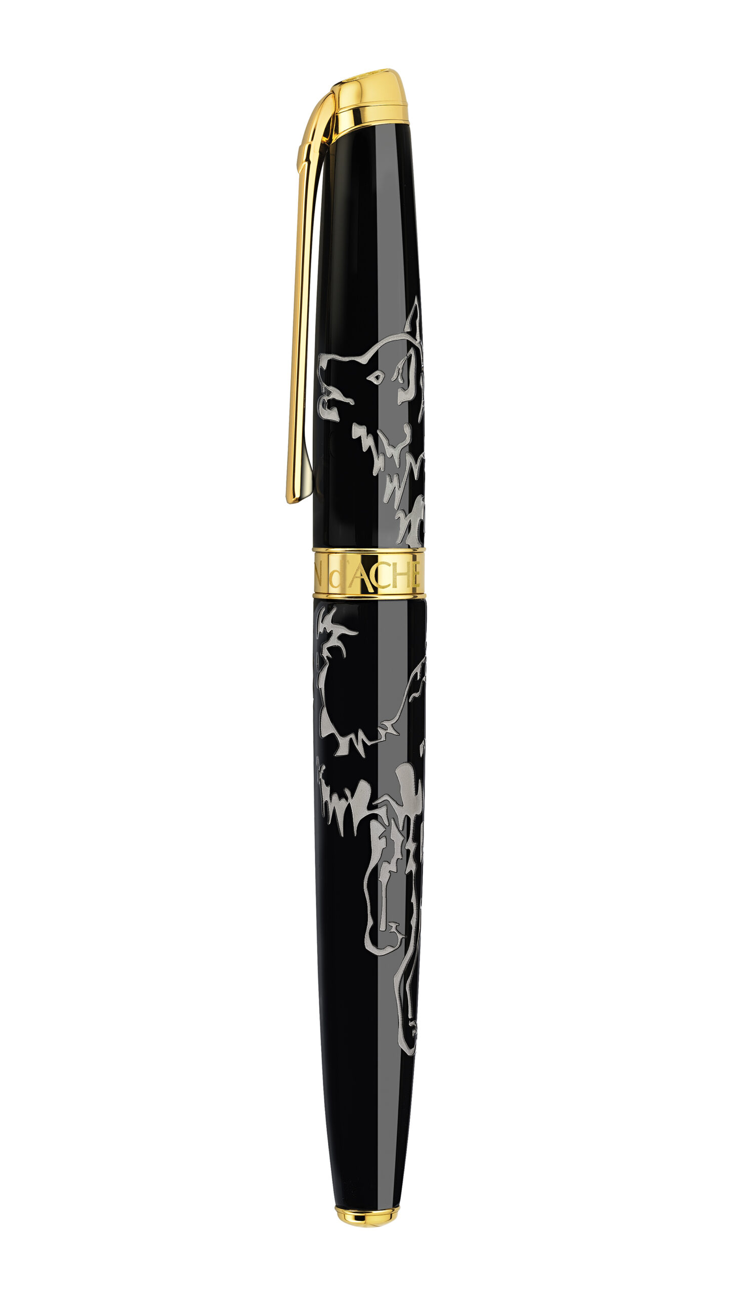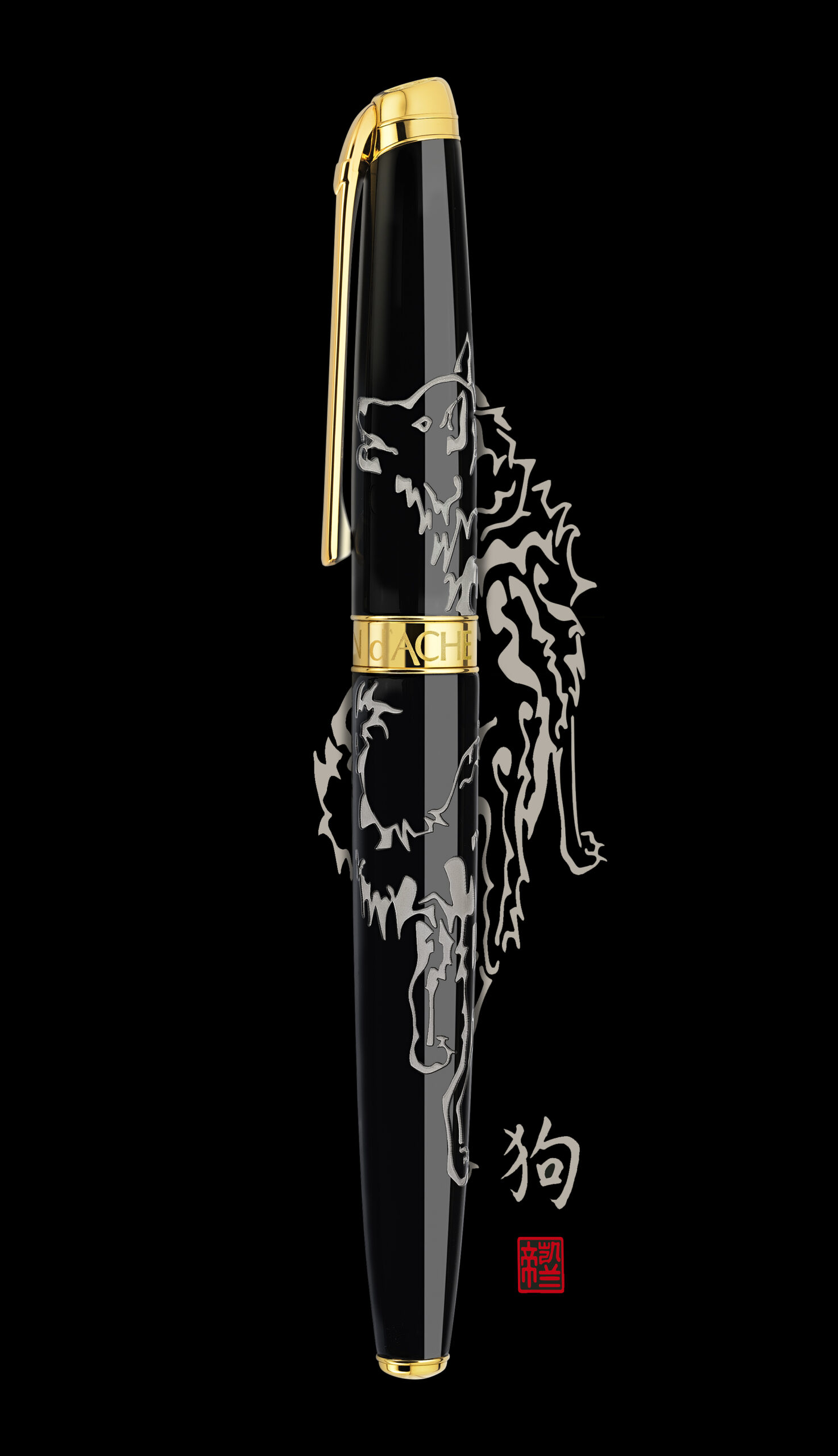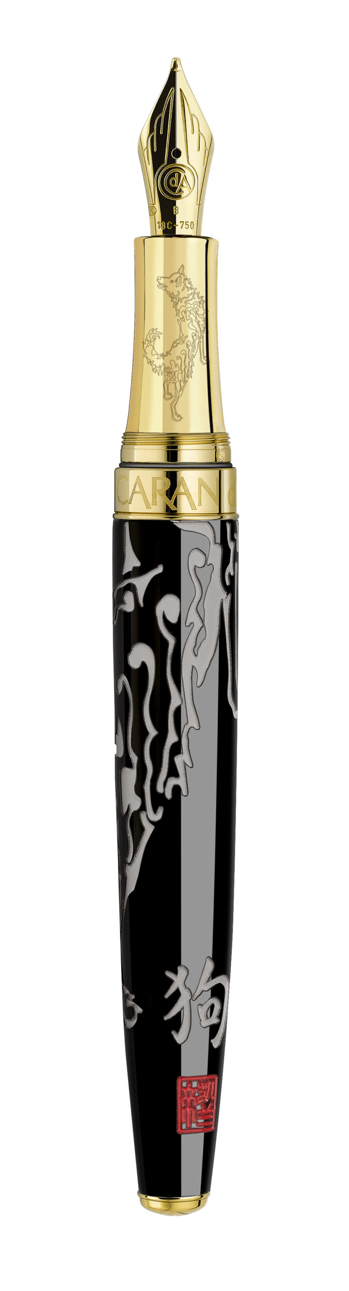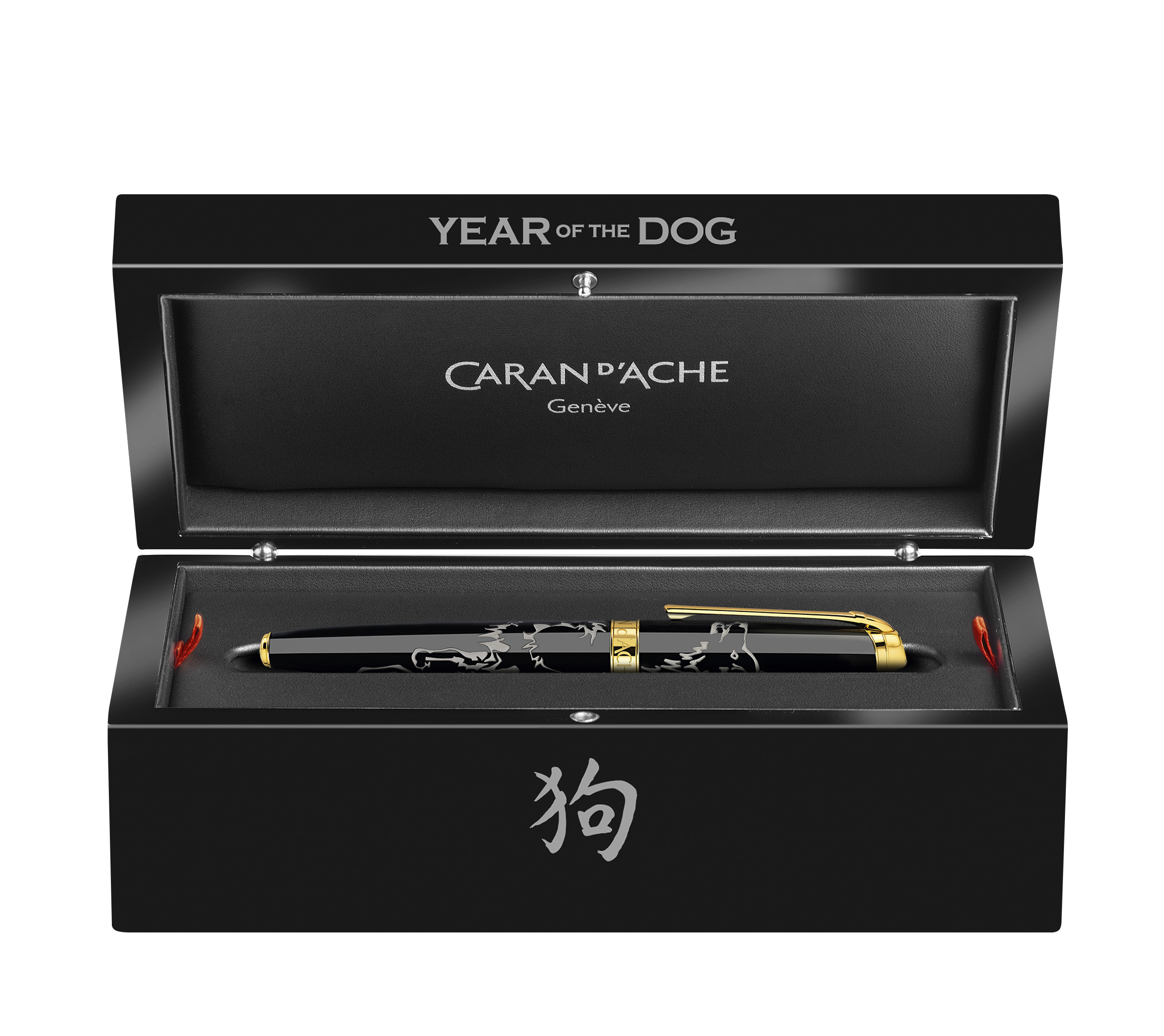 • El cuerpo y el capuchón: lucen la representación de un perro en laca china gris sobre un fondo de laca negra china pulida. El sello chino de Caran d’Ache aparece en color rojo.