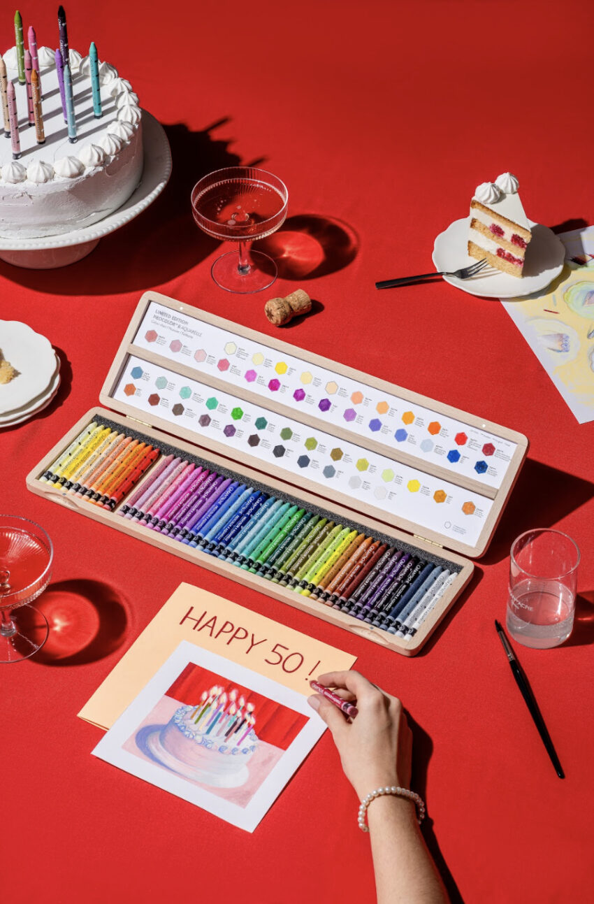 La primera consiste en quince colores nuevos que la firma presenta en cinco cajas que conforman igual número de paletas temáticas: Pop, Lush, Portrait, Pastel y Dark, todas ellas con diez lápices de colores que incluyen tres tonos completamente nuevos. En conjunto, la firma desarrolló un total de quince nuevos colores con los que celebra este vistoso aniversario. Cada surtido se presenta en la icónica caja roja metálica embellecida con el logotipo del 50 aniversario y una funda específica para cada uno que muestra su gama de colores.