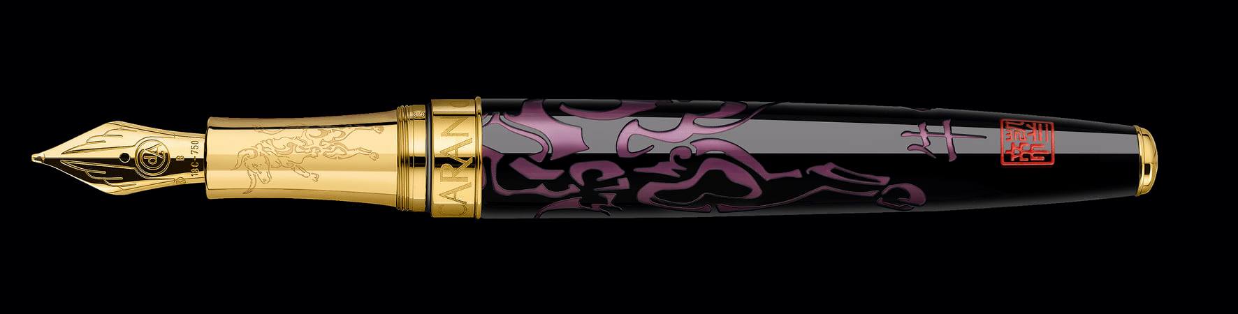 El símbolo está representado por la silueta púrpura del Buey que emerge en la capa de laca china negra, un adorno exquisito para esta estilográfica. El diseño del animal está grabado y posee un baño de oro amarillo que acentúa su robusto cuerpo y la postura vigilante. La mirada dominante y confiada es ejemplo claro del poder y la sabiduría representada por el Buey.