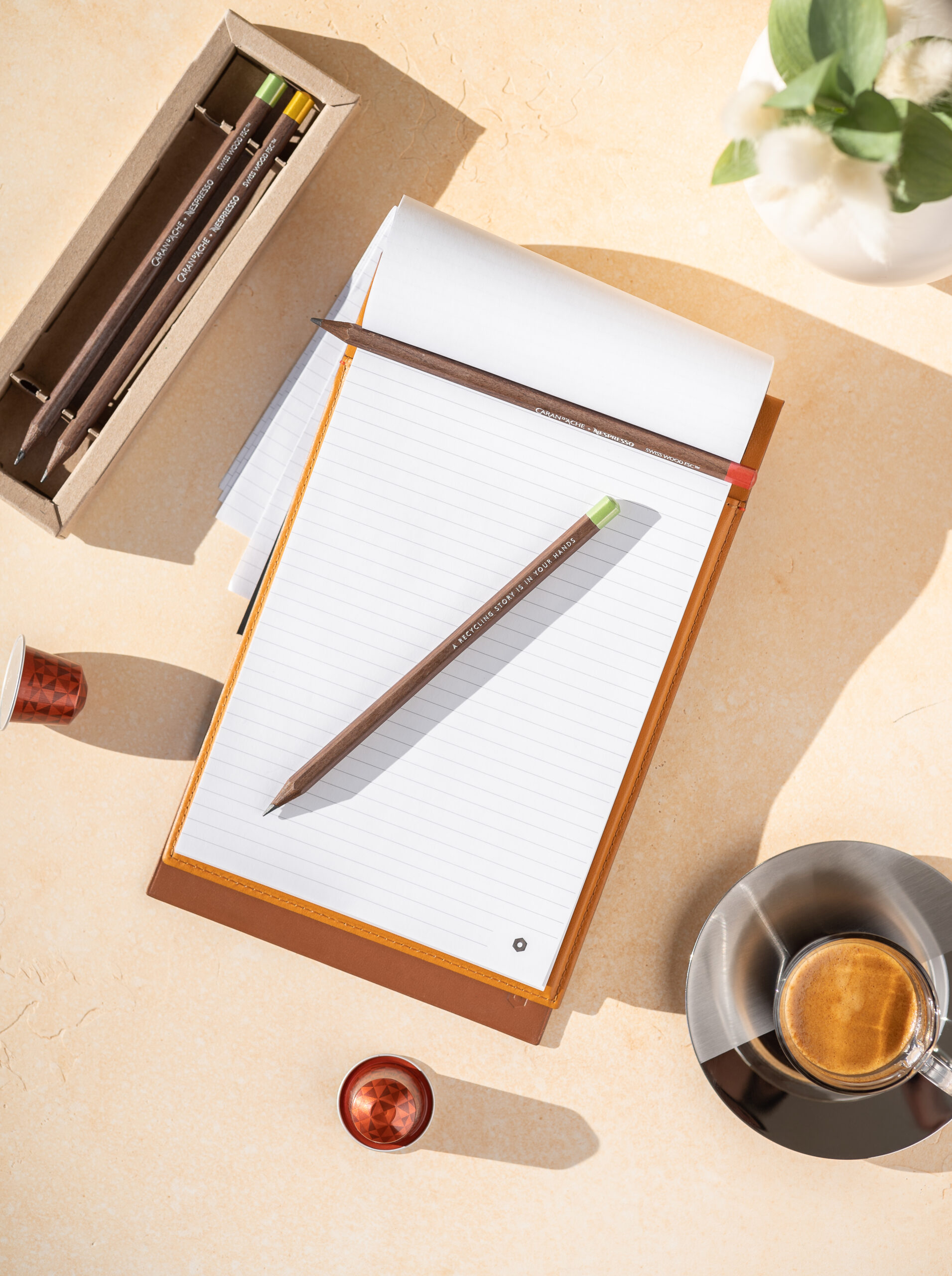 Adicionalmente, se presenta un exclusivo set de tres lápices de grafito 100% naturales, y hechos de madera de “Haya” de los bosques del “Jura Suizo”con certificación FSC y decorados con tres colores inspirados igualmente en las cápsulas metálicas en tonos rosa, verde y oro.