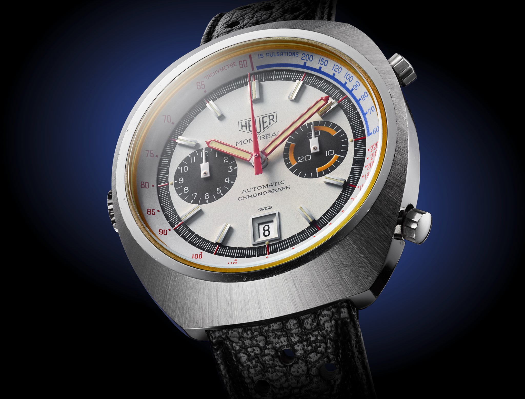 El Montreal de Heuer se empleó en una colección de cronógrafos lanzada en 1972 dentro de la colección Carrera, específicamente en la referencia 110503W, que exhibía una paleta cromática roja, amarilla y azul, con un diseño de carátula equilibrado y apegado a la época de los 70. Retoma la estética para presentar una carátula en color blanco mate con totalizadores en efecto azurage, azulados tipo panda. Además, el contador de minutos –3 h– luce tres líneas curvas recubiertas de Super-LumiNova amarillo; la aguja trotadora de cronógrafo se exhibe en rojo y las horas y minutos también reciben este luminova. La escala juega con el rojo y el azul, mientras que un sutil punto de Super-LumiNova amarillo se posiciona al borde de los índices aplicados, logrando un diseño histórico y bellísimo, tanto de día como de noche. Remata el conjunto la inscripción Carrera Heuer con el logo original en punto de las 12 horas; su caja se extiende hasta los 39 mm de diámetro. Edición Limitada a 1,000 ejemplares.