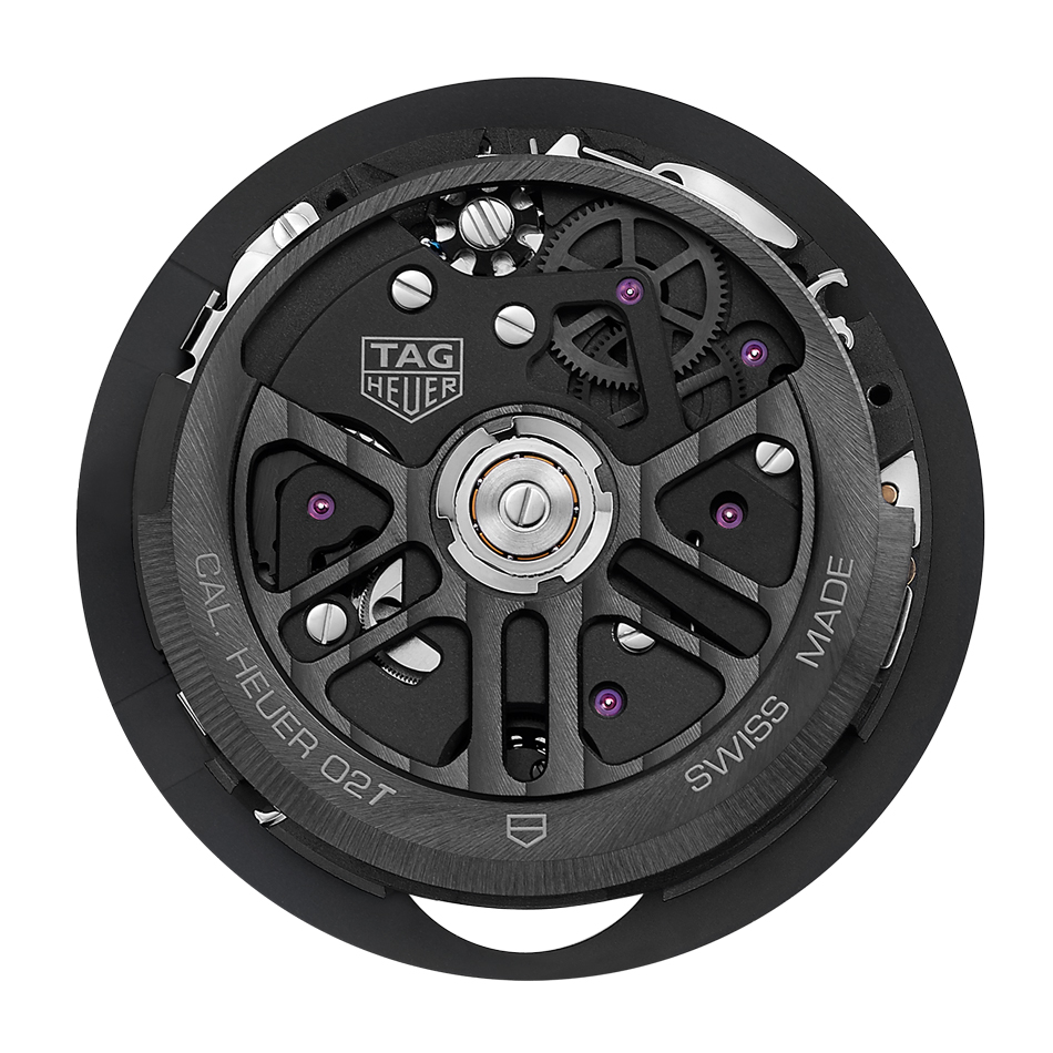 Esta última particularidad se refleja en la alimentación de un tourbillon volante de construcción ligera inspirado en el desarrollo del torbellino del Monaco V4, logrando hasta 65 horas de autonomía gracias a una carga automática. La creación y montaje del tourbillon son ejecutados a mano en los talleres de TAG Heuer por cuatro relojeros expertos, destaca la espiral del órgano regulador encargada a Atokalpa. Tanto el rotor como la rueda de pilares han sido teñidos en color negro, haciendo juego con los puentes del cronógrafo.