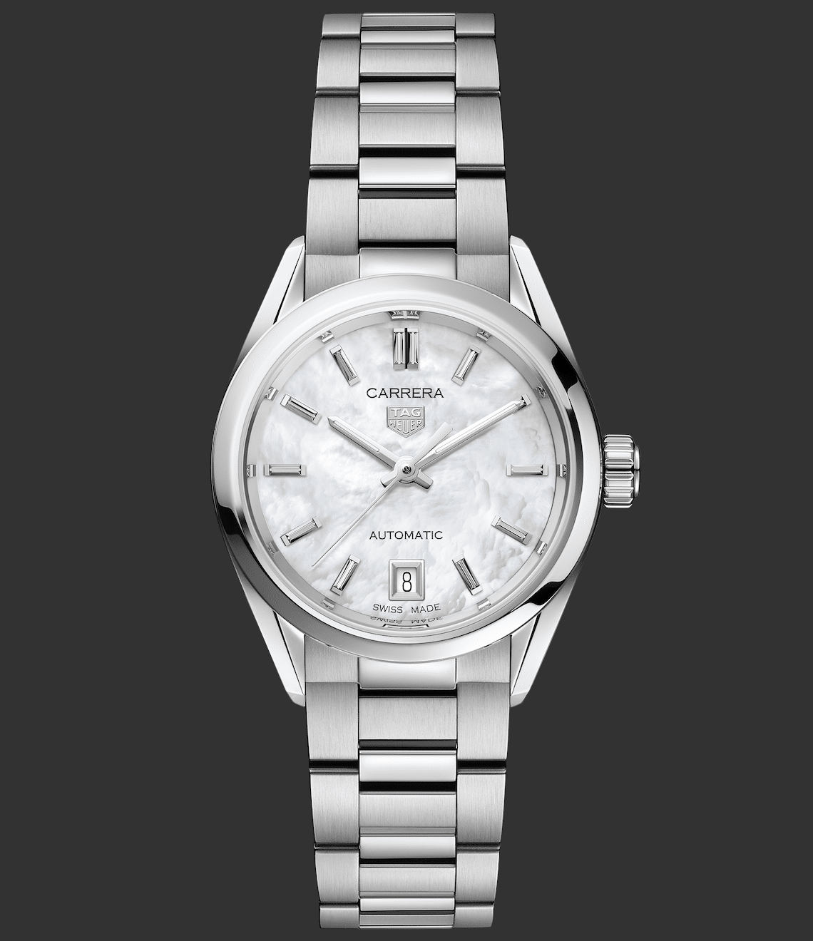 Finalmente, viene la versión femenina. El Carrera Date 29 mm también late gracias a un movimiento automático Calibre 9 y, en armonía con todas las versiones de la colección, lleva el novedoso brazalete con eslabones en forma de H que abraza la muñeca de una mujer. La carátula es limpia y refinada, y es posible lucir la versión con ventanilla de fecha a las 6 h e índices indicados con el brillo de diamantes.