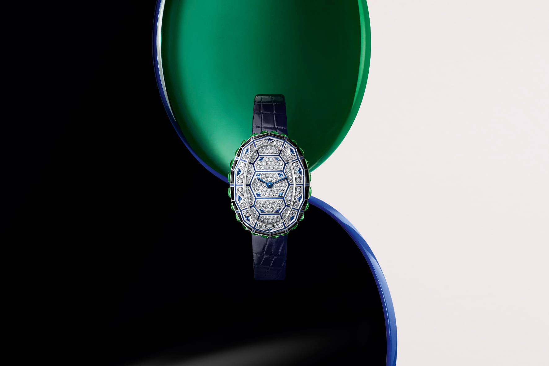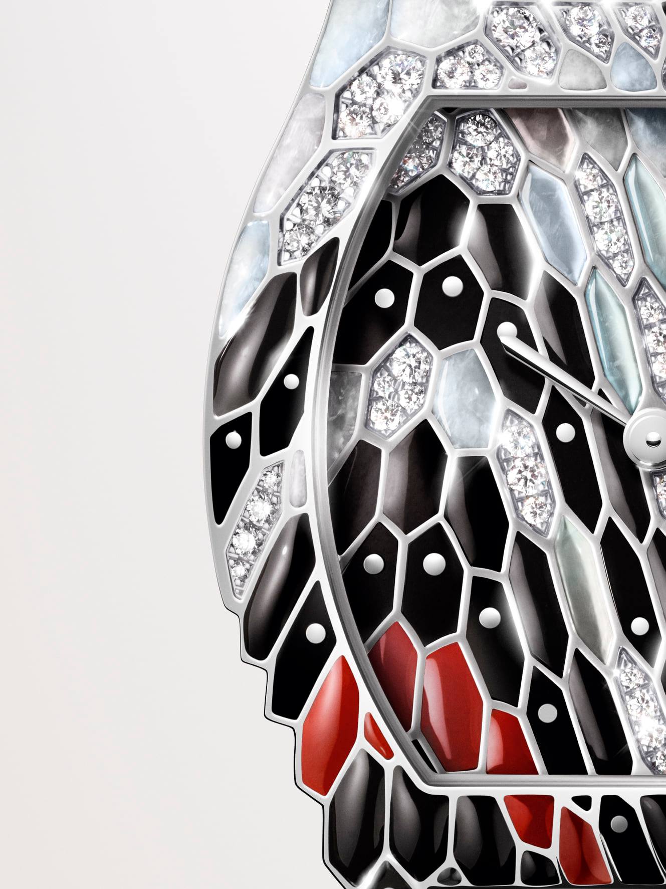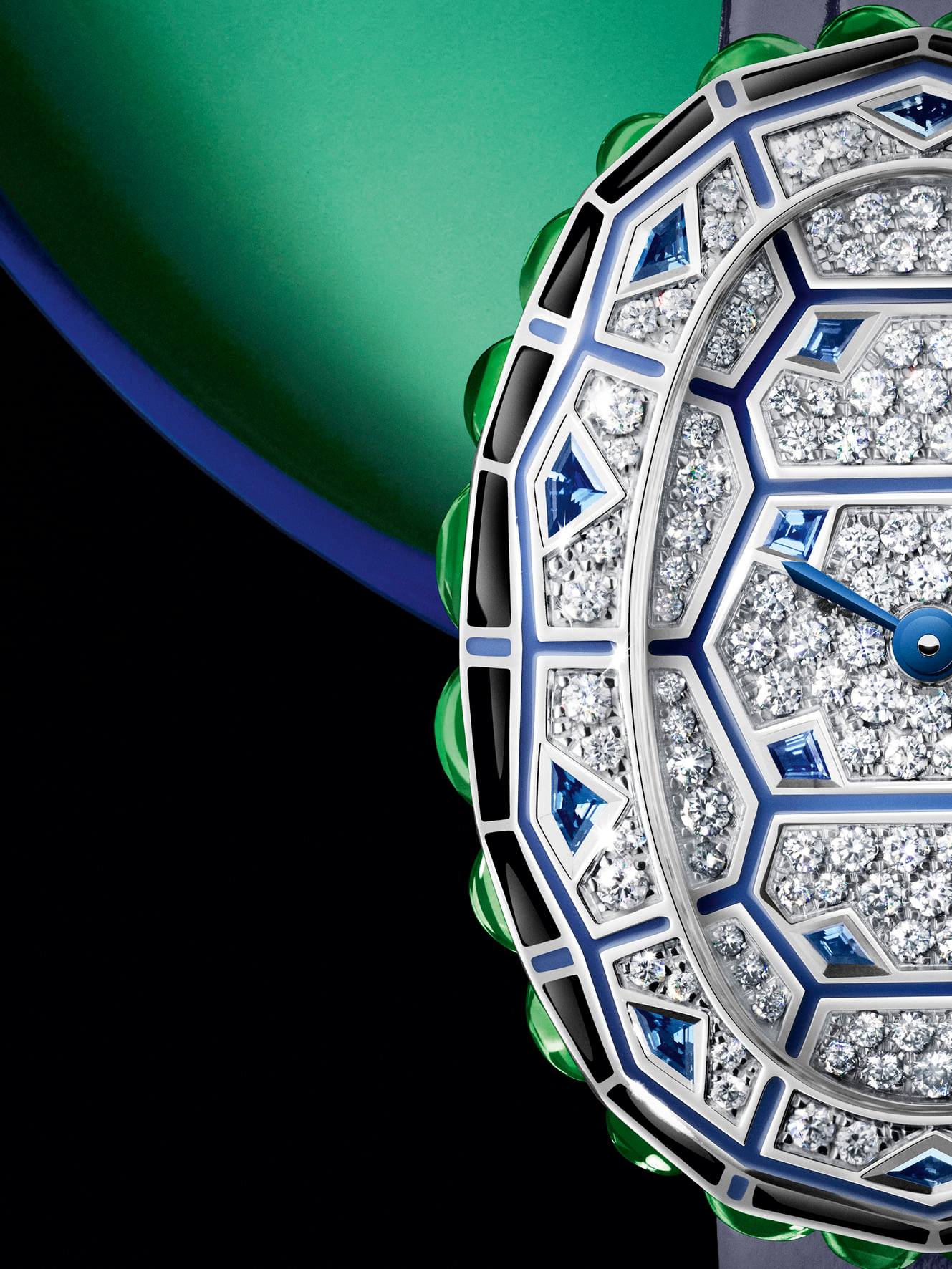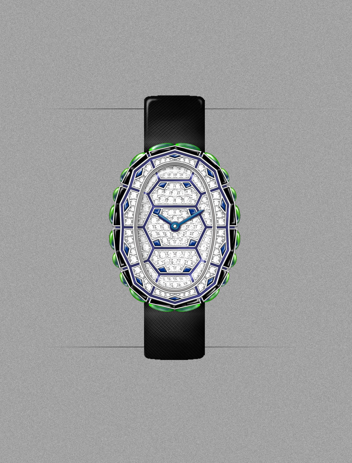 La carátula con pavé aleatorio de diamantes, presenta un juego de líneas antracita o negras, composición geométrica de un motivo de escamas, caja rodeada por un galón de tsavoritas suiffé, zafiros suiffé en el interior de la esfera y en las esquinas de los tres hexágonos centrales: el reloj demuestra su aptitud para la transformación.