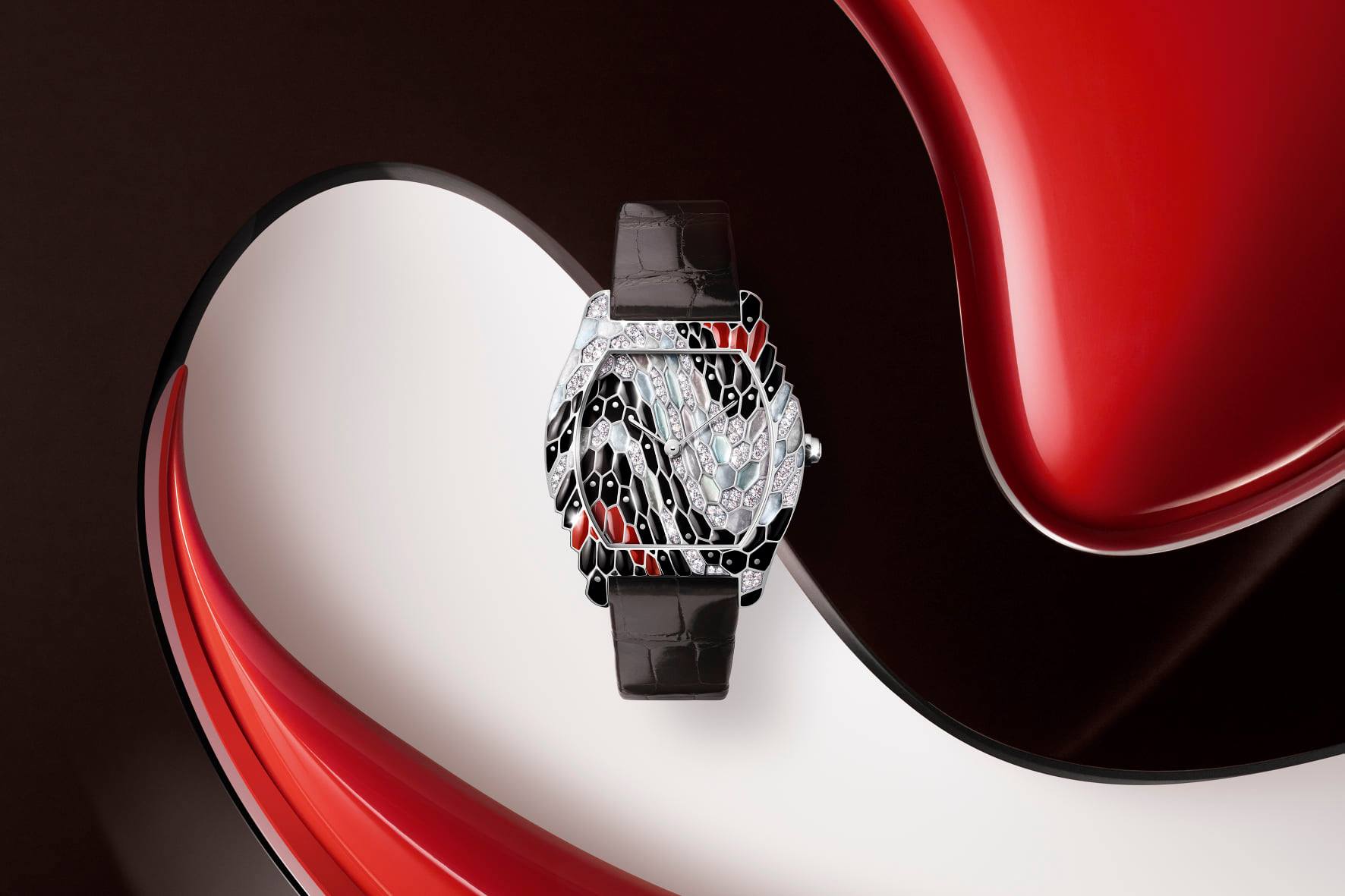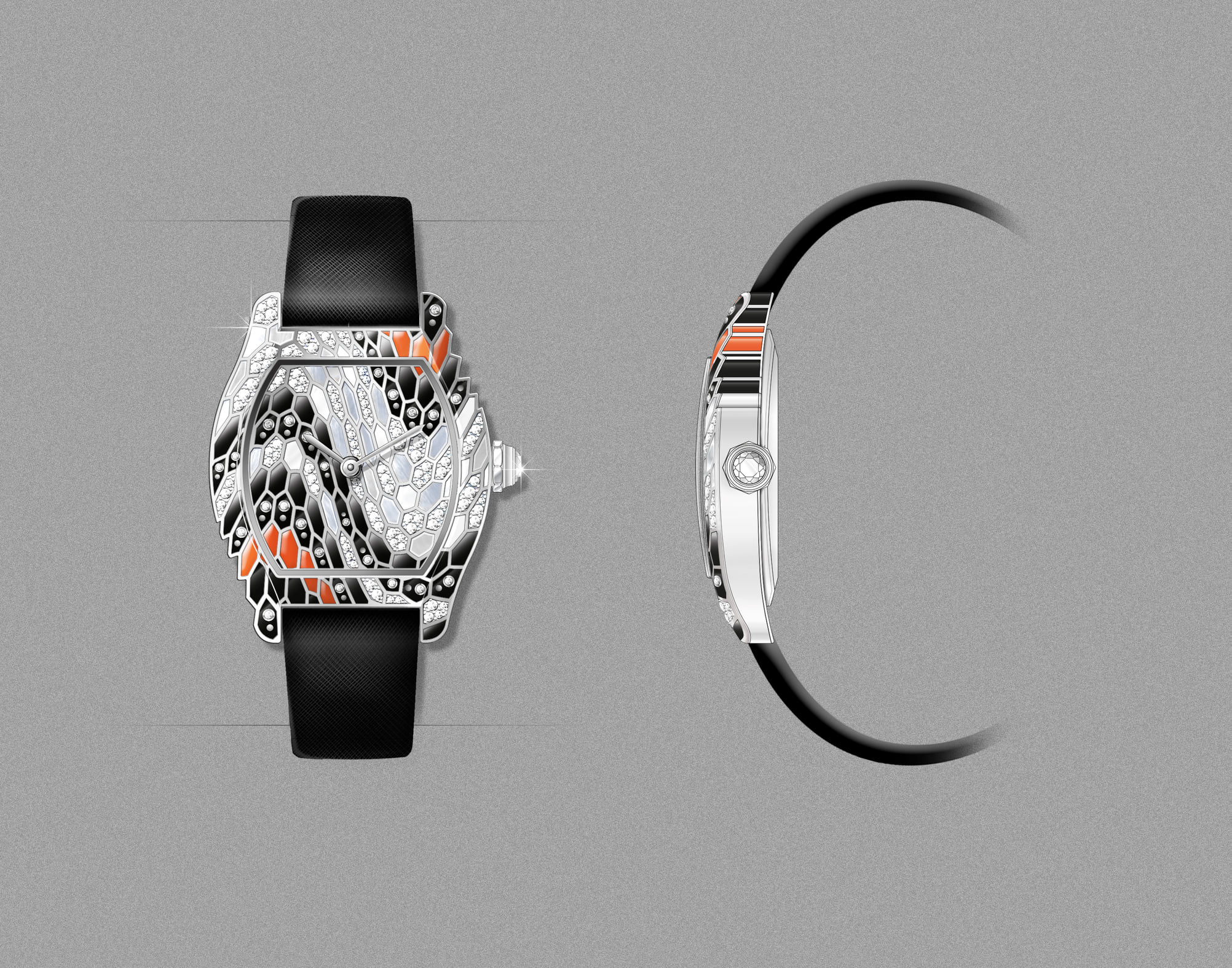 Esta nueva edición de Cartier Libre confiere a este gran clásico de la relojería una transformación inesperada y lo viste con motivos de escamas y curvas anilladas que recorren un fondo límpido con tonos azulados o grises claros. La serpiente, representada por una multitud de detalles y juegos de materiales, es a la vez una sugerencia y una presencia. Esmalte negro o coral, nácar con tonos de agua, todo ello iluminado por gotas de oro pulido y la presencia de diamantes con engaste cerrado en la caja y la corona de cuerda.