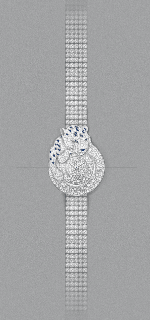 La pantera, animal icónico de Cartier, es representada en muchas piezas de relojera y joyería dentro de la Maison. En esta ocasión, los nuevos relojes joya Panthère Songeuse se caracterizan por tener al felino en la parte superior de la caja totalmente engastada de diamantes y algunas piedras preciosas.