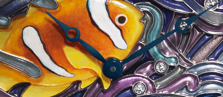 En esta pieza Cartier creó la sensación del agua con matices azules transparentes. Ha tenido un gran éxito al acentuar el brillante esmaltado plique-à-jour y las sombras traslúcidas que evocan los corales del fondo del mar. Cinco azules distintos afrontan los grises y violetas en una gama de tonos profundos. Los esmaltados están suspendidos entre frágiles alambres, tan elegantes y delicados como trazos de lápiz que juegan con la luz. Para esta valiosa técnica, Cartier añadió pintura de nácar al crear un pez en relieve. Su anaranjado cítrico y su alto estilo gráfico contribuyen a la calidad onírica de la carátula.