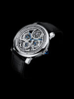 Finalmente destacamos tres piezas que llaman poderosamente la atención, una por la complicación de utilizar la base del calibre esqueleto y números romanos para sostener al Astrotourbillon, mientras que el Crash confirma el buen conocimiento mecánico de la firma con sede en La Chaux –de– Fonds (división relojera), al realizar un calibre mecánico esqueletado en la forma de una caja Crash. Ahora bien, el plato fuerte fue dejado al final, y se trata de la Grande Complication, un nuevo calibre, el más complicado realizado en casa que posee la particularidad de indicar calendario perpetuo, torbellino y repetidor a minutos por pulsador.