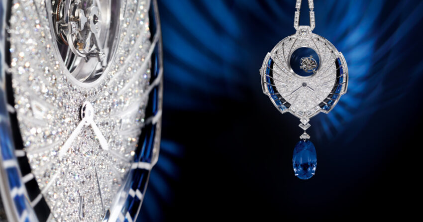 Cuando la Alta Relojería y Joyería se unen, los resultados suelen ser impresionantes. Es así como nace el protagonista de hoy, una creación que nos intriga. Un collar que asemeja una mariposa, en la que las alas están decoradas con zafiros y líneas de diamantes que llegan hasta formar también el cuerpo. En el centro, apreciamos una carátula transparente que nos presume un doble tourbillon suspendido en el vacío, característica emblemática del expertise relojero de Cartier. La cadena con motivos geométricos engastada con diamantes, está decorada con un zafiro ovalado –desmontable- de 25.93 quilates, una extraordinaria joya de Sri Lanka.