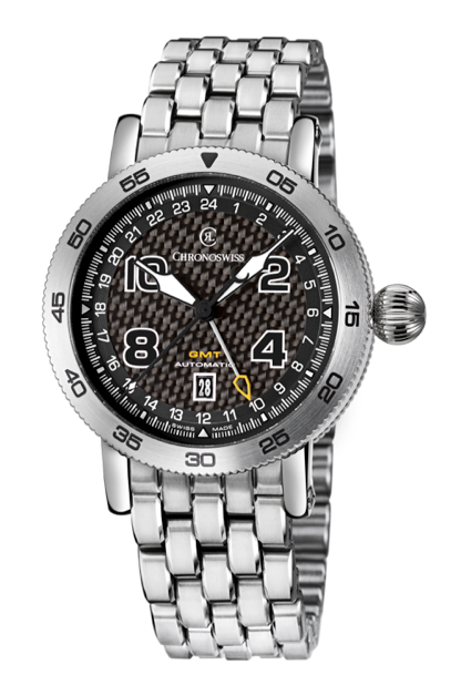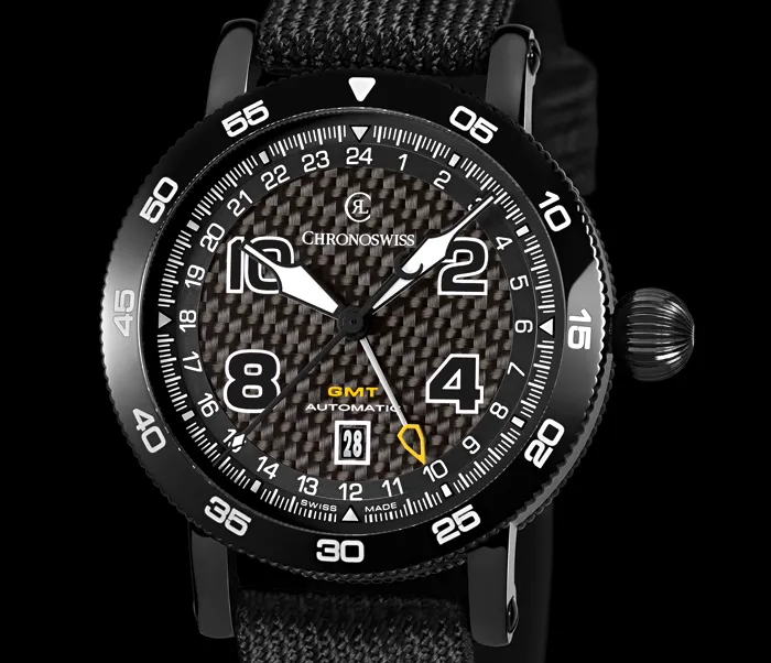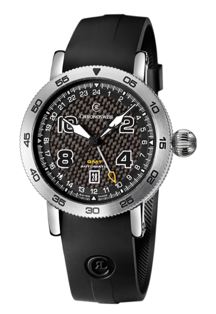 - CHRONOSWISS TIMEMASTER GMT: CH-2535 caja de acero inoxidable con tratamiento DLC y carátula de fibra de carbón.