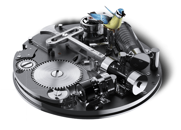 Ubicado en caja de oro blanco de 47 mm de diámetro, proporciona la información de las horas y minutos mediante una carátula en punto de las 12, mientras que “el vuelo” del pájaro cantor tridimensional se sitúa a las 6 horas. Esto es posible gracias a un cristal de zafiro completamente abombado en forma de media esfera. Ahora bien, el ave es desarrollada en el atelier y para completarla son necesarias veinte horas de intenso trabajo.