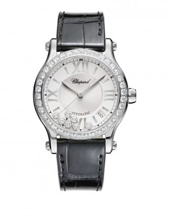 Elegante y sofisticado, fiel al espíritu del Happy Sport original, el nuevo Happy Sport Medium Automatic presenta en el anverso una carátula argenté guilloché, como homenaje a la tradicional decoración de la relojería clásica y el fondo ideal para hacer destacar sus siete diamantes móviles.