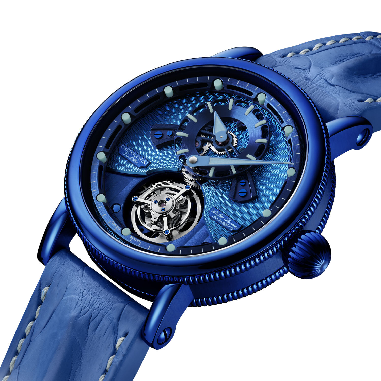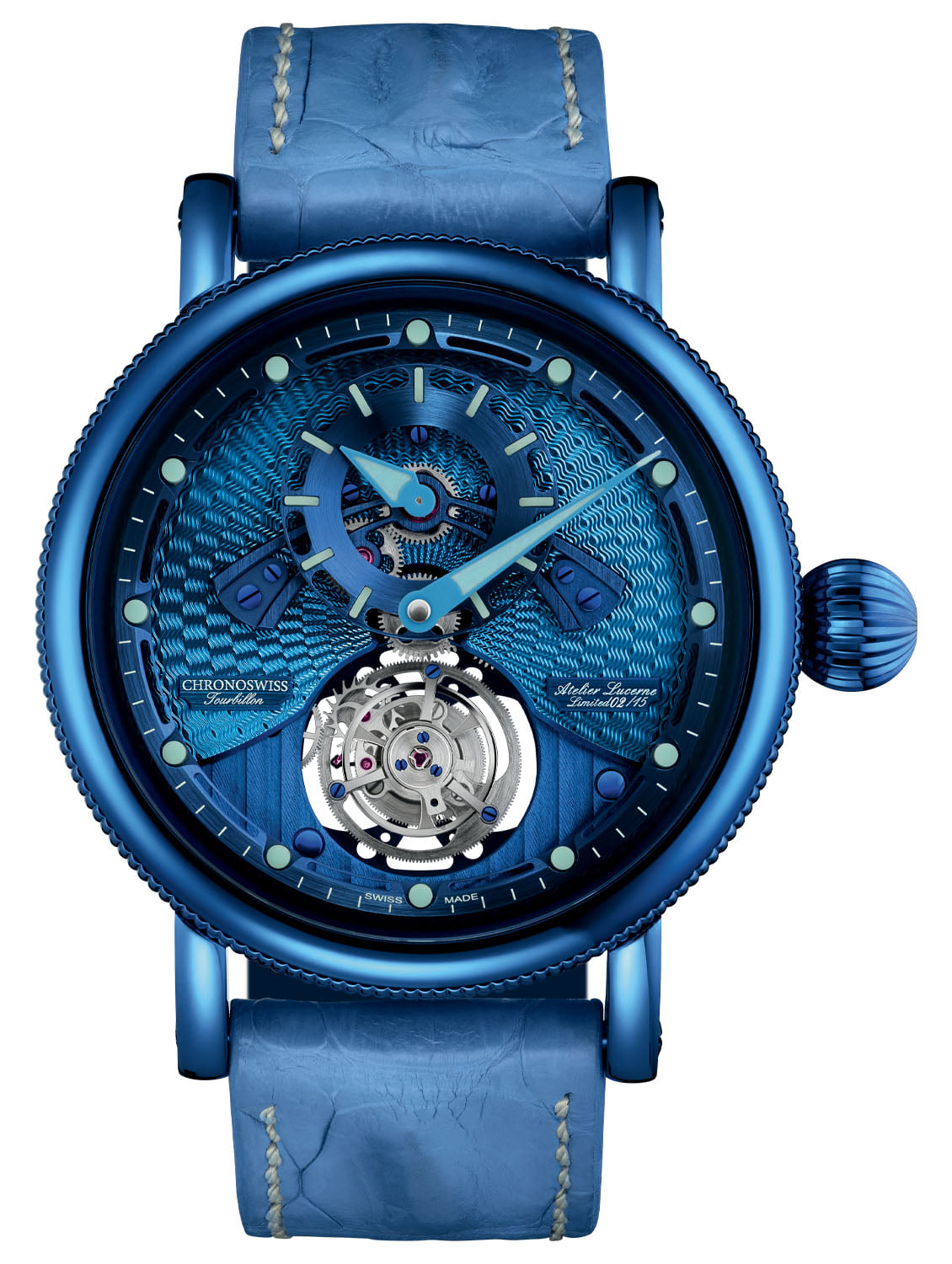 La caja ofrece un diámetro de 44 mm y luce la característica corona tipo cebolla de la marca. El material es acero inoxidable recubierto con tratamiento CVD azul eléctrico, éste se posa en cuernos, corona y fondo de la pieza. Finalmente, la correa es de piel de cocodrilo teñida a juego con el color de la pieza, y es una Edición Limitada a 15 ejemplares.