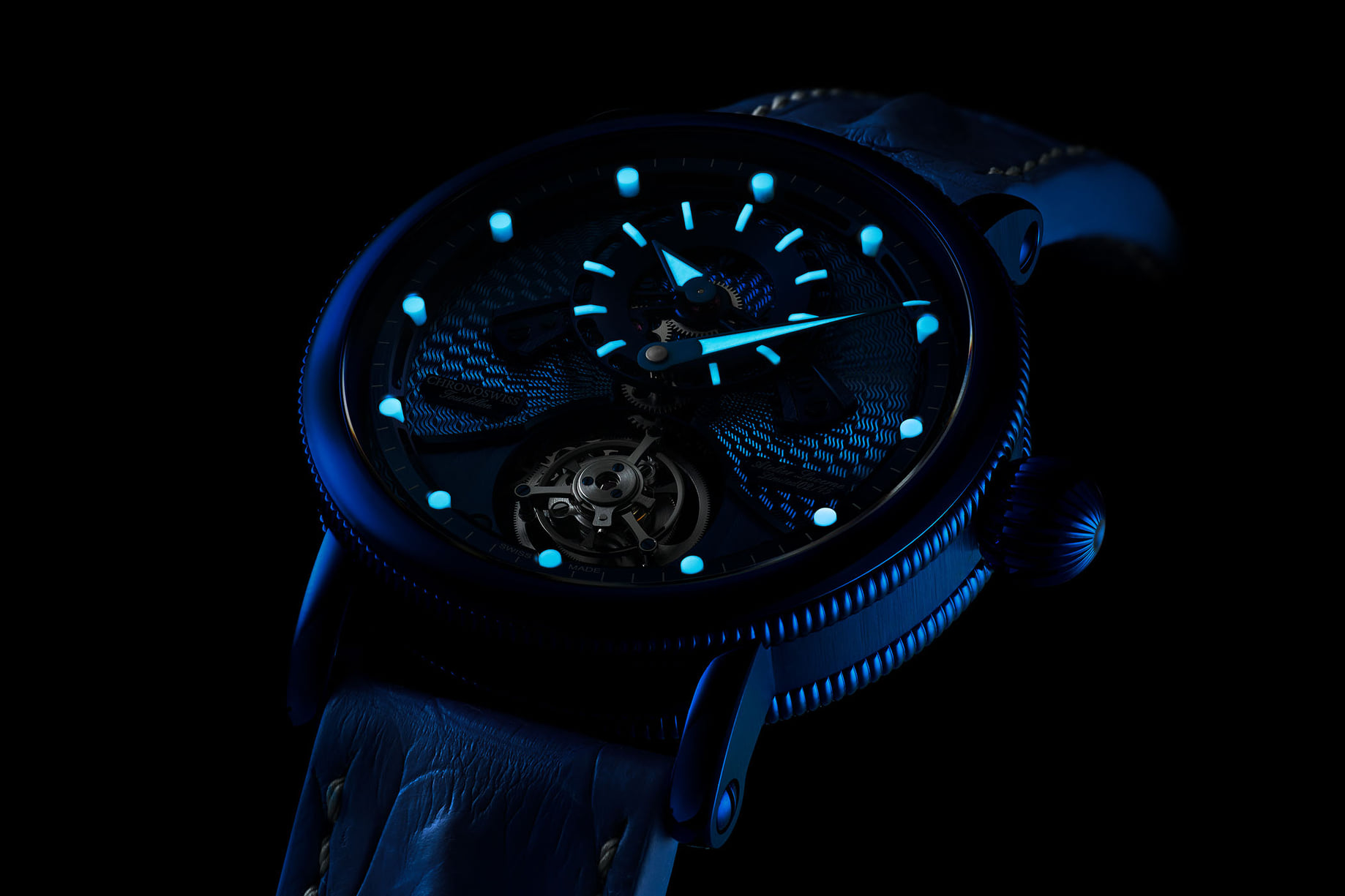 La carátula es espectacular de día, pero vista de noche es una verdadera locura, en el buen sentido de la palabra. Cuenta con una base en guilloché hecha a mano y con índices fabricados íntegramente en Super-LumiNova azul. En total son 42 partes propuestas en dos niveles, con ruedas esqueletadas y construcción orientada hacia el norte: horas mediante una subcarátula a las 12 h; minutos centrales y protagonistas como en todo regulador y tourbillon a las 6 en punto.