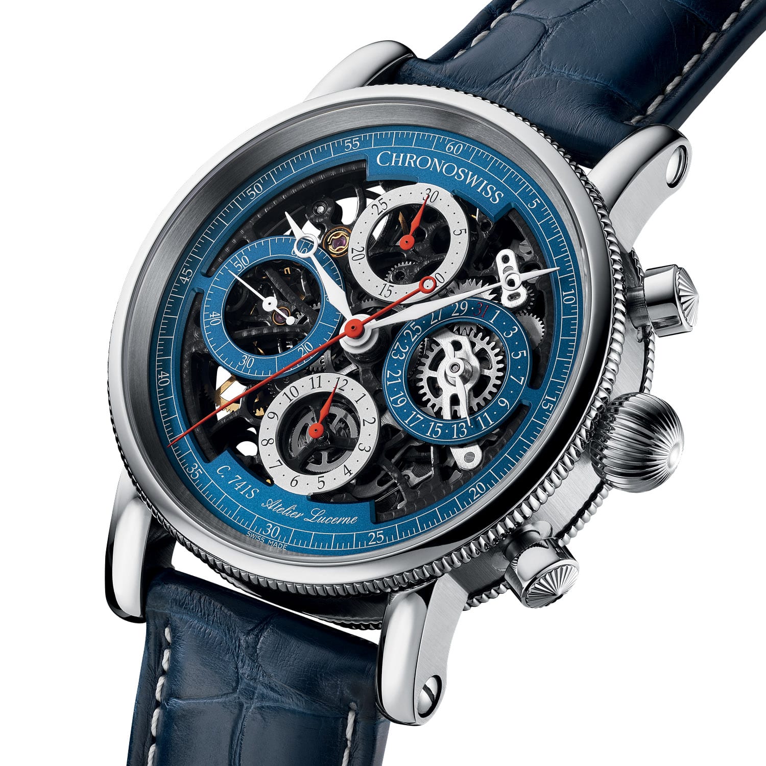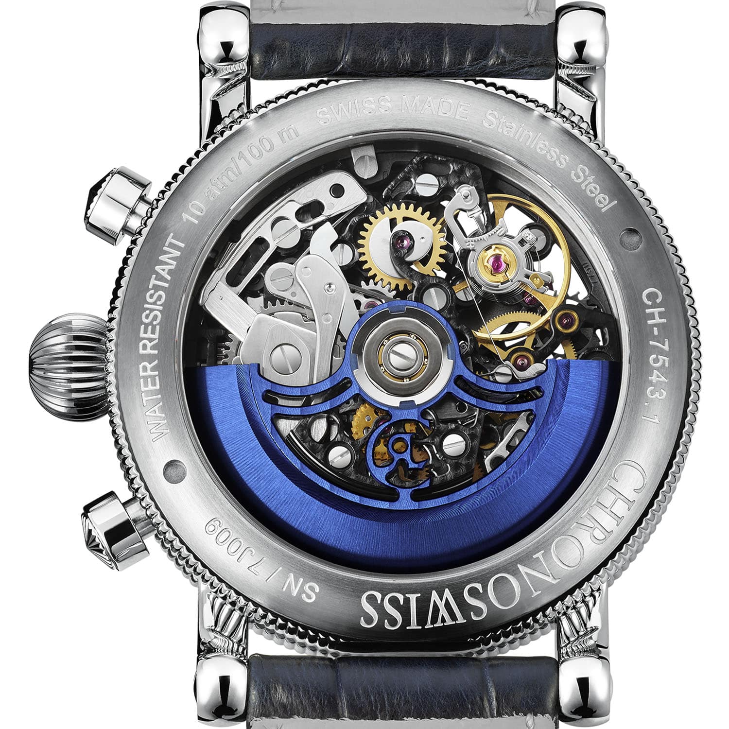 Cuenta con el calibre C.741S de remonte automático (base Valjoux 7750), ofrece una marcha a 4 Hz y ostenta una reserva de marcha de 46 horas. La masa oscilante luce color azul, acabado esqueletado y está chapada en CVD con un sutil Côtes de Genève.