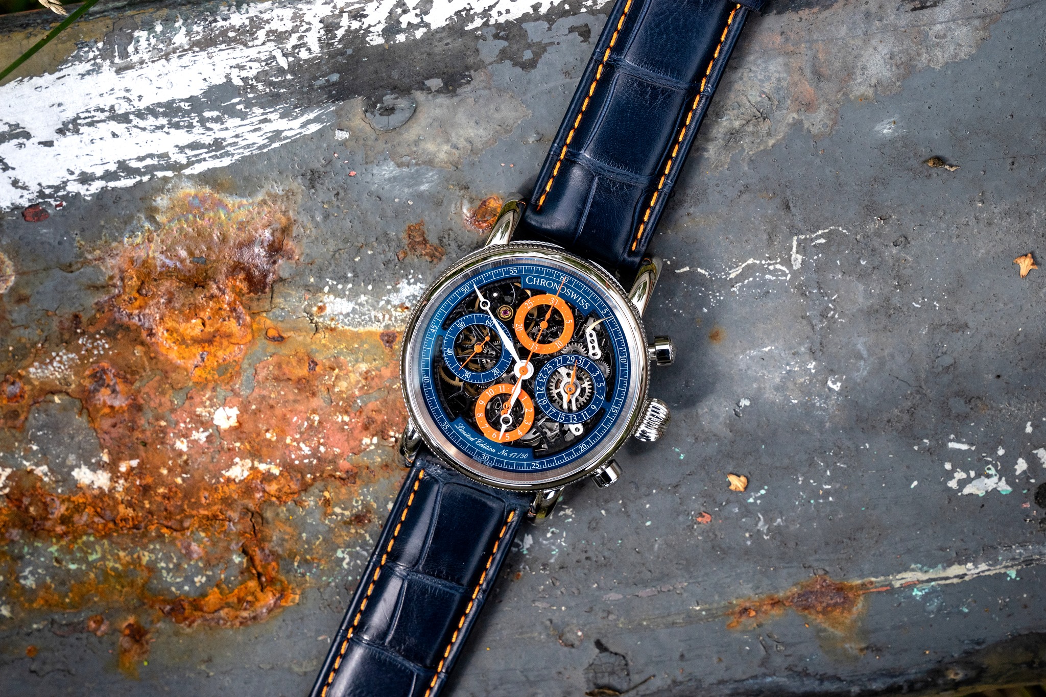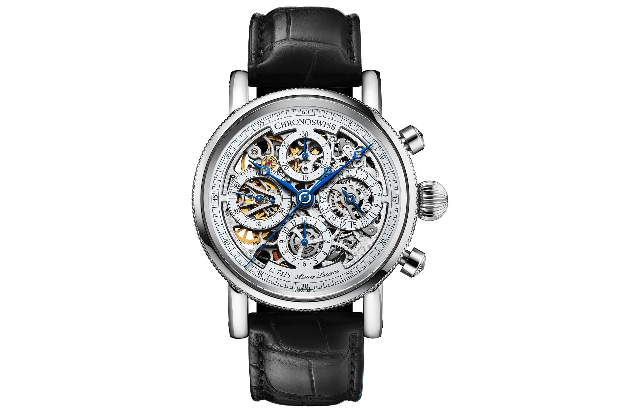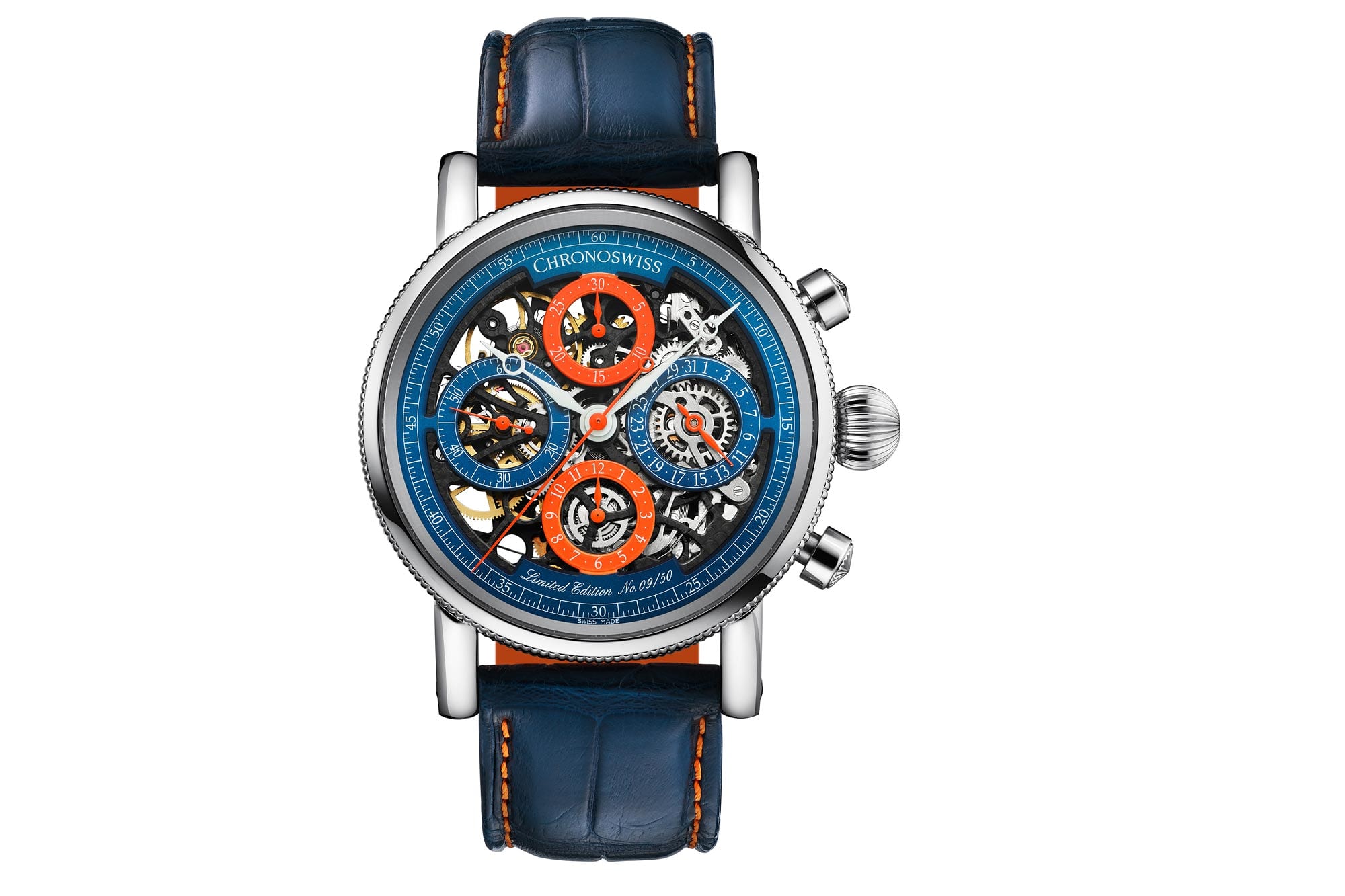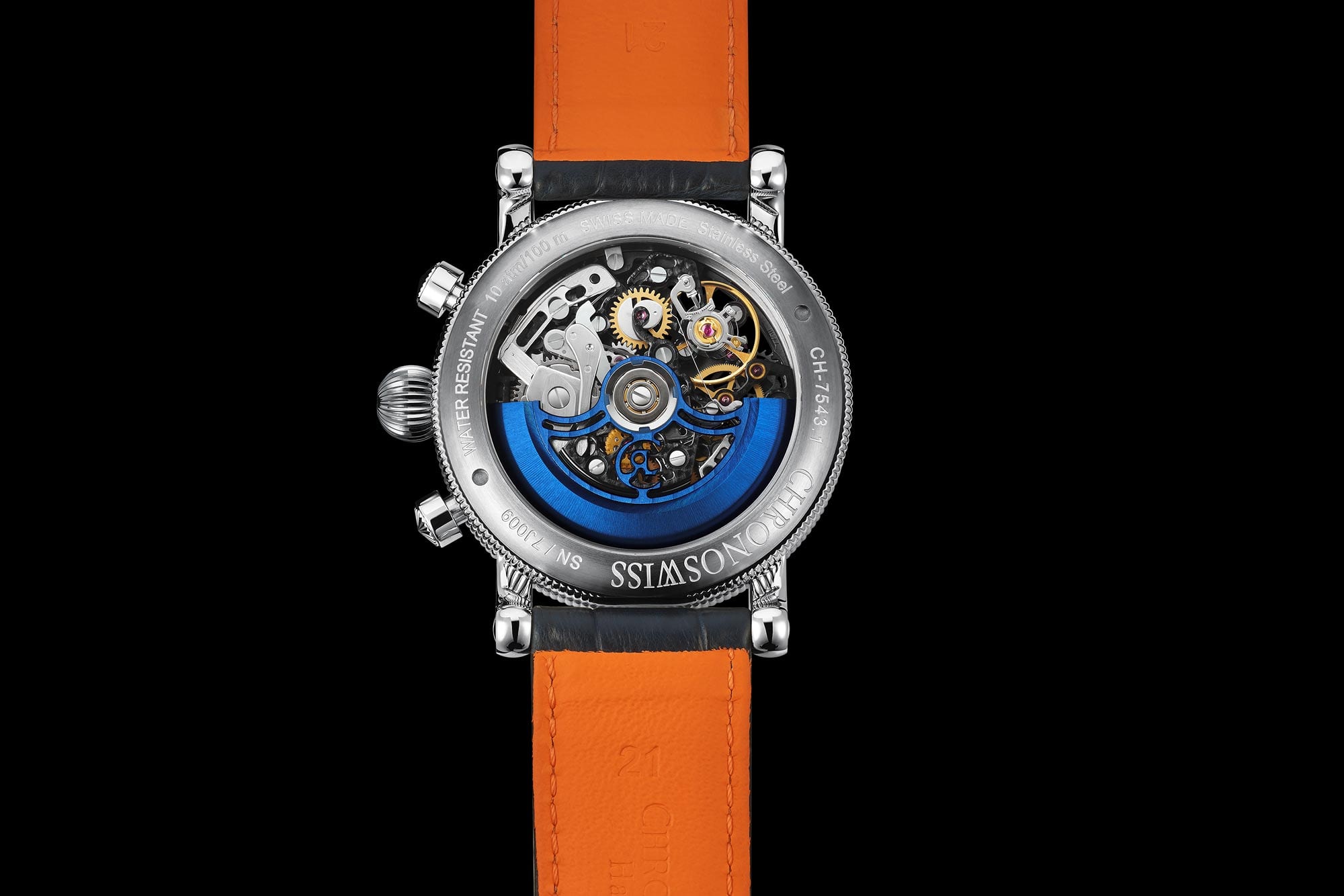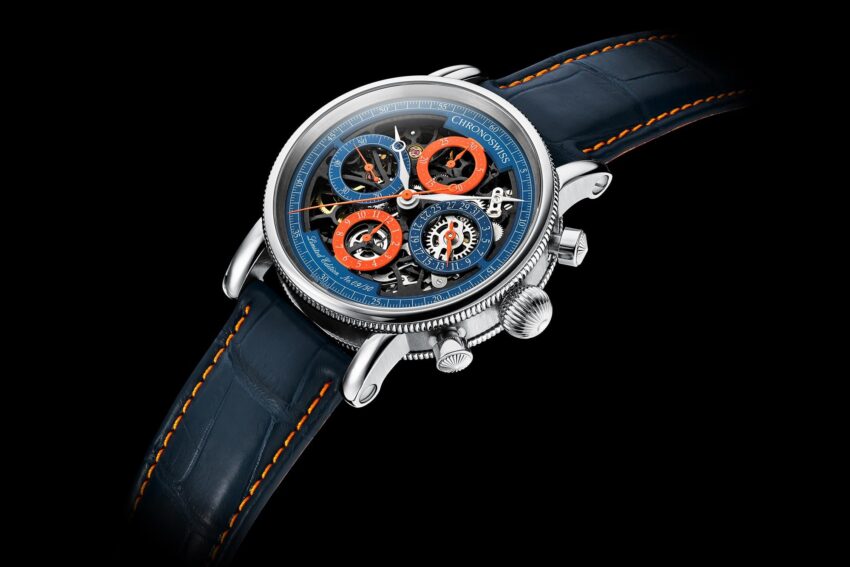 Cada una de las dos referencias lucen personalidades distintas y, como ha sucedido en el Chronoswiss de los últimos años, no hay miedo alguno a jugar con el color. En primera instancia destaca un diseño con carátula azul y naranja en contraste con el acero inoxidable de la caja. El conjunto se complementa con una pulsera de piel de cocodrilo azul con pespuntes anaranjados. La segunda referencia es más clásica, fabricada en acero inoxidable, agujas Breguet de acero azulado y correa de piel de cocodrilo color negro. En el interior vibra un calibre mecánico automático finamente esqueletado que brinda la posibilidad de conocer: horas, minutos, segundos, totalizador de minutos y horas, adicional al fechador por aguja.