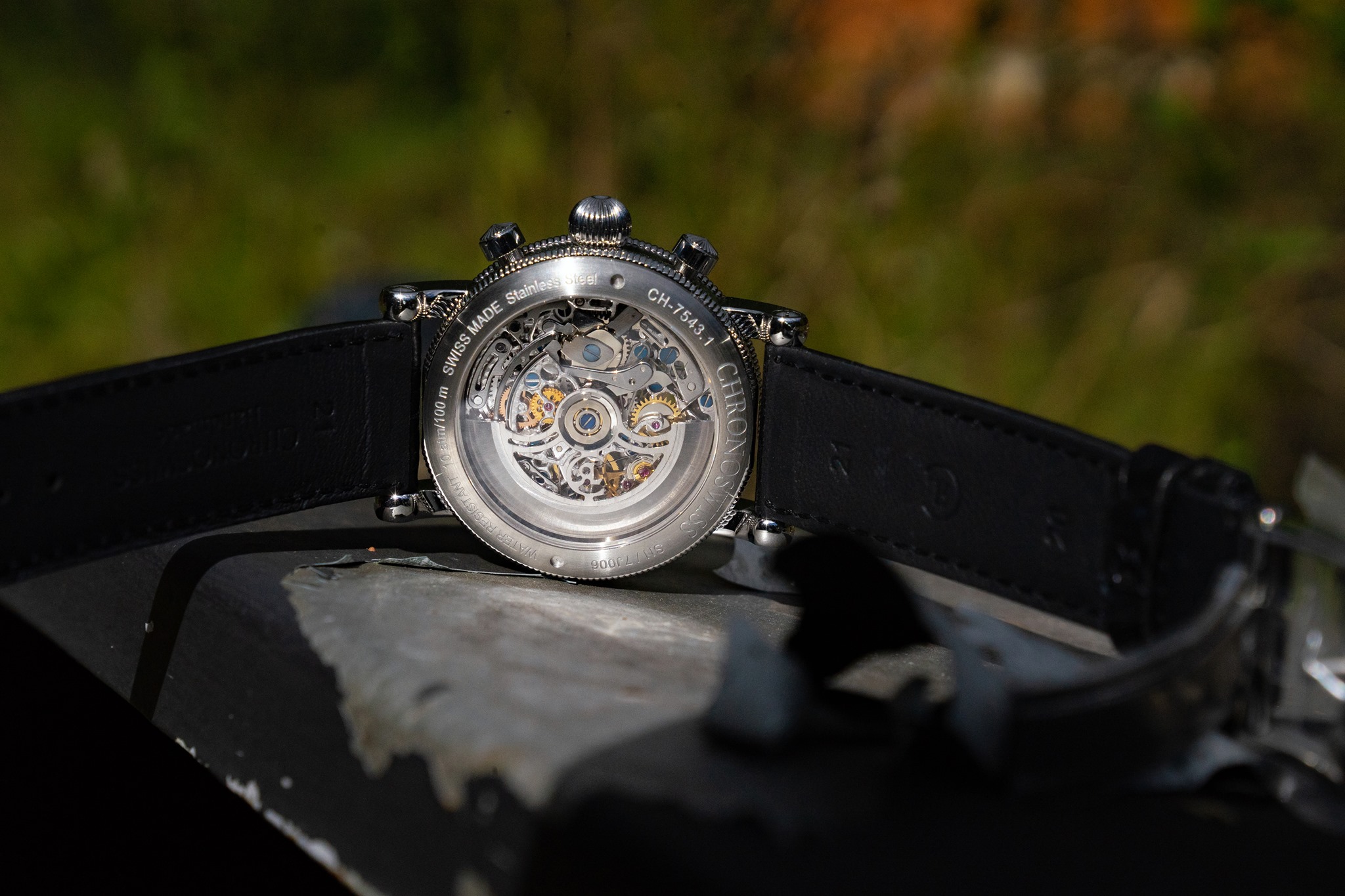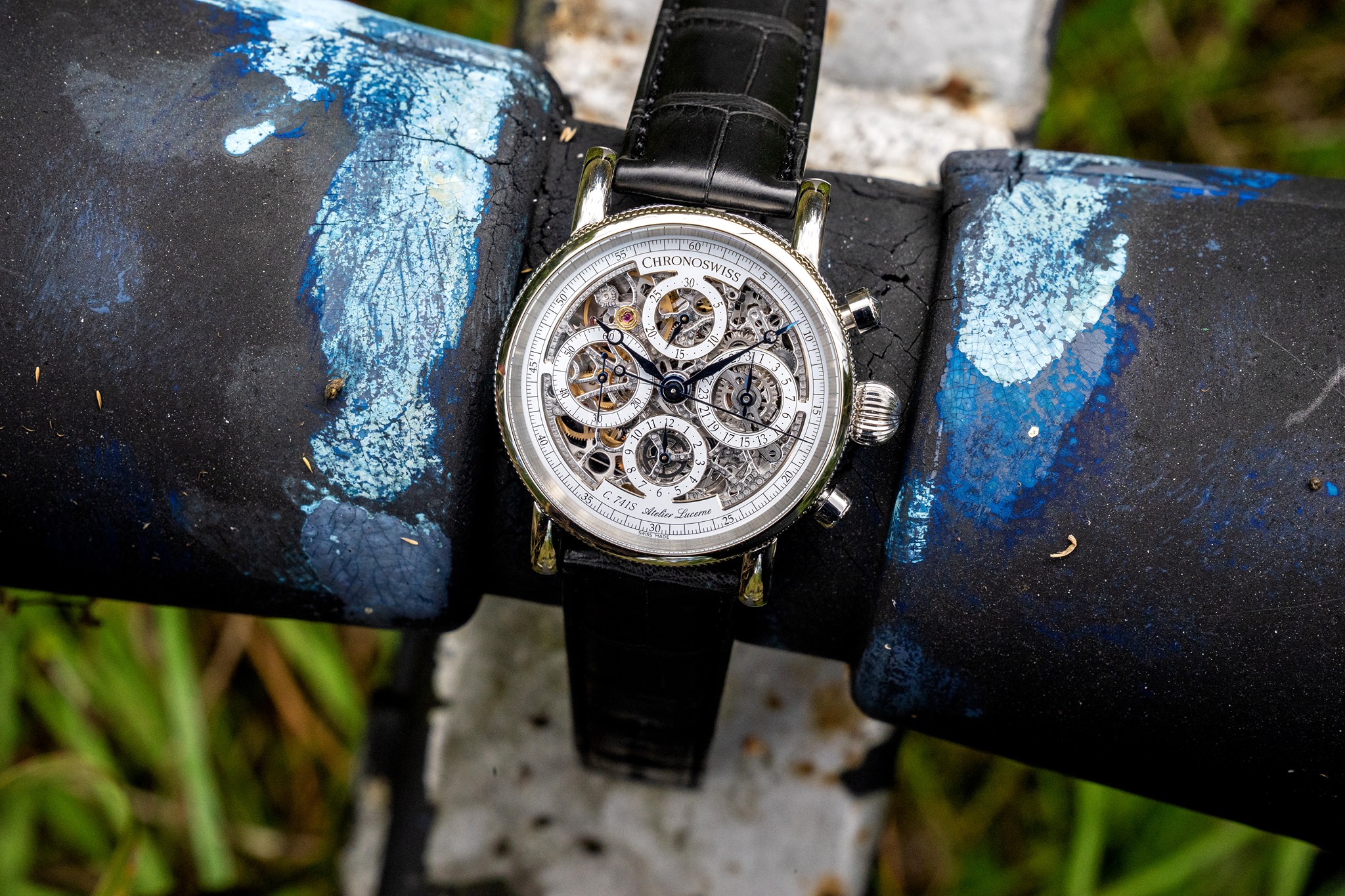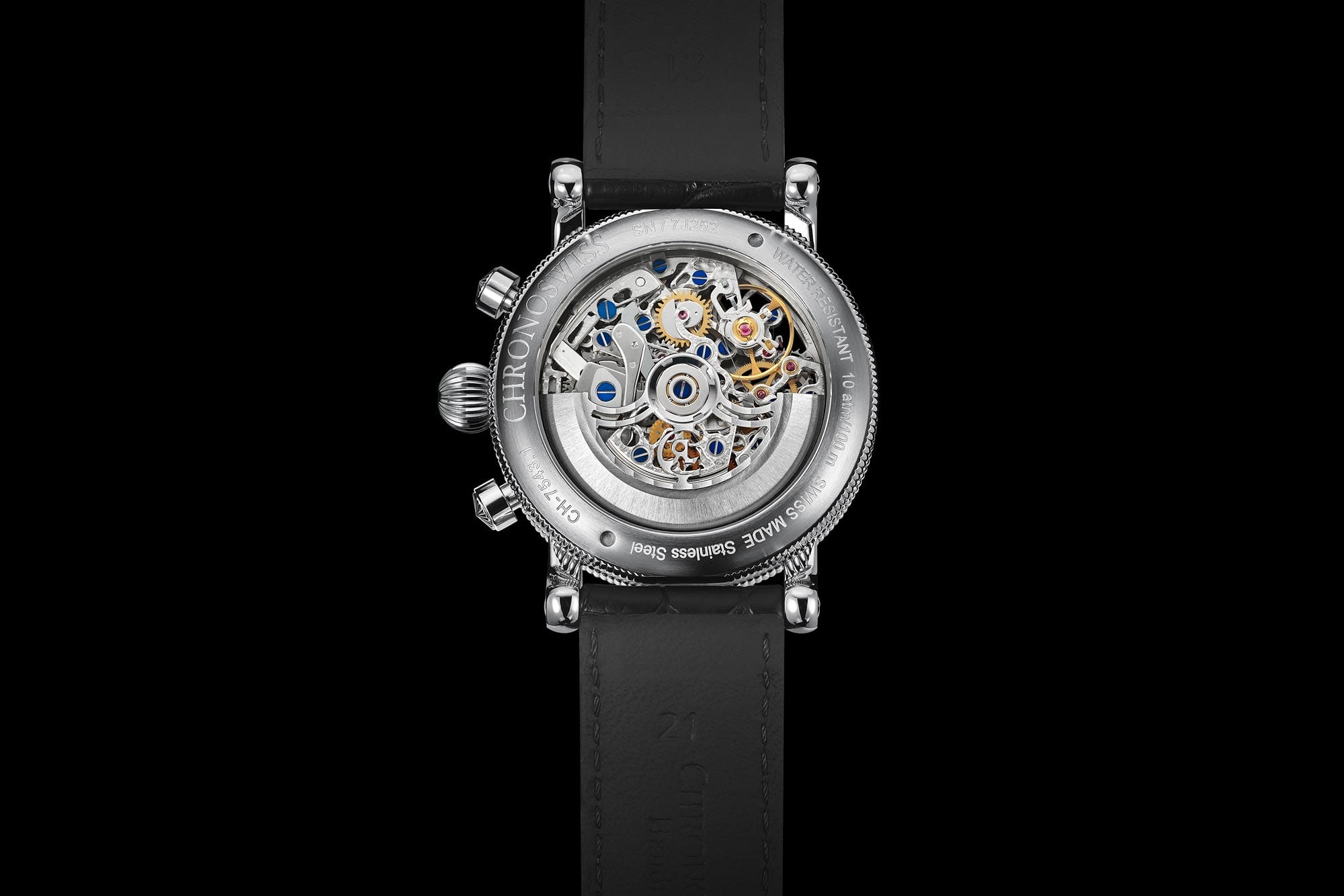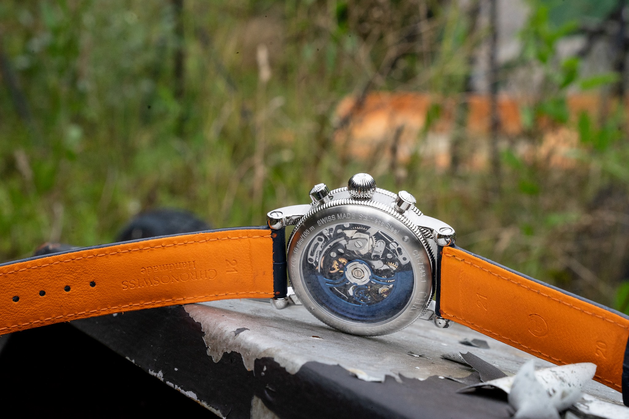 Cada una de las dos referencias lucen personalidades distintas y, como ha sucedido en el Chronoswiss de los últimos años, no hay miedo alguno a jugar con el color. En primera instancia destaca un diseño con carátula azul y naranja en contraste con el acero inoxidable de la caja. El conjunto se complementa con una pulsera de piel de cocodrilo azul con pespuntes anaranjados. La segunda referencia es más clásica, fabricada en acero inoxidable, agujas Breguet de acero azulado y correa de piel de cocodrilo color negro. En el interior vibra un calibre mecánico automático finamente esqueletado que brinda la posibilidad de conocer: horas, minutos, segundos, totalizador de minutos y horas, adicional al fechador por aguja.